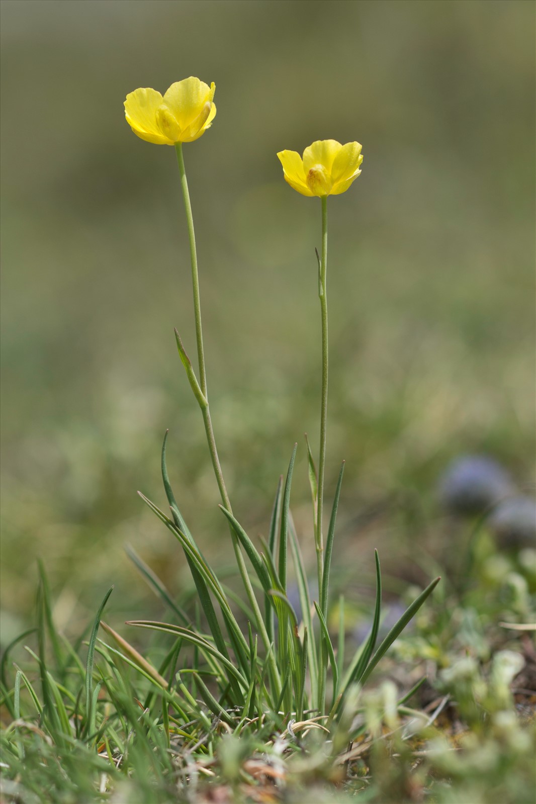 Souche vivace, renflée, chevelue, à fibres épaisses ; tige de 10-40 cm, droite, simple ou peu rameuse, glabre feuilles toutes lancéolées-linéaires, très entières, fermées ; fleurs jaunes, grandes, peu nombreuses, longuement pédonculées ; sépales glabres ; pétales ovales-triangulaires ; réceptacle glabre ; carpelles en tête ovoïde, glabres, renflés, non carénés, ridés, à bec court, un peu arqué.