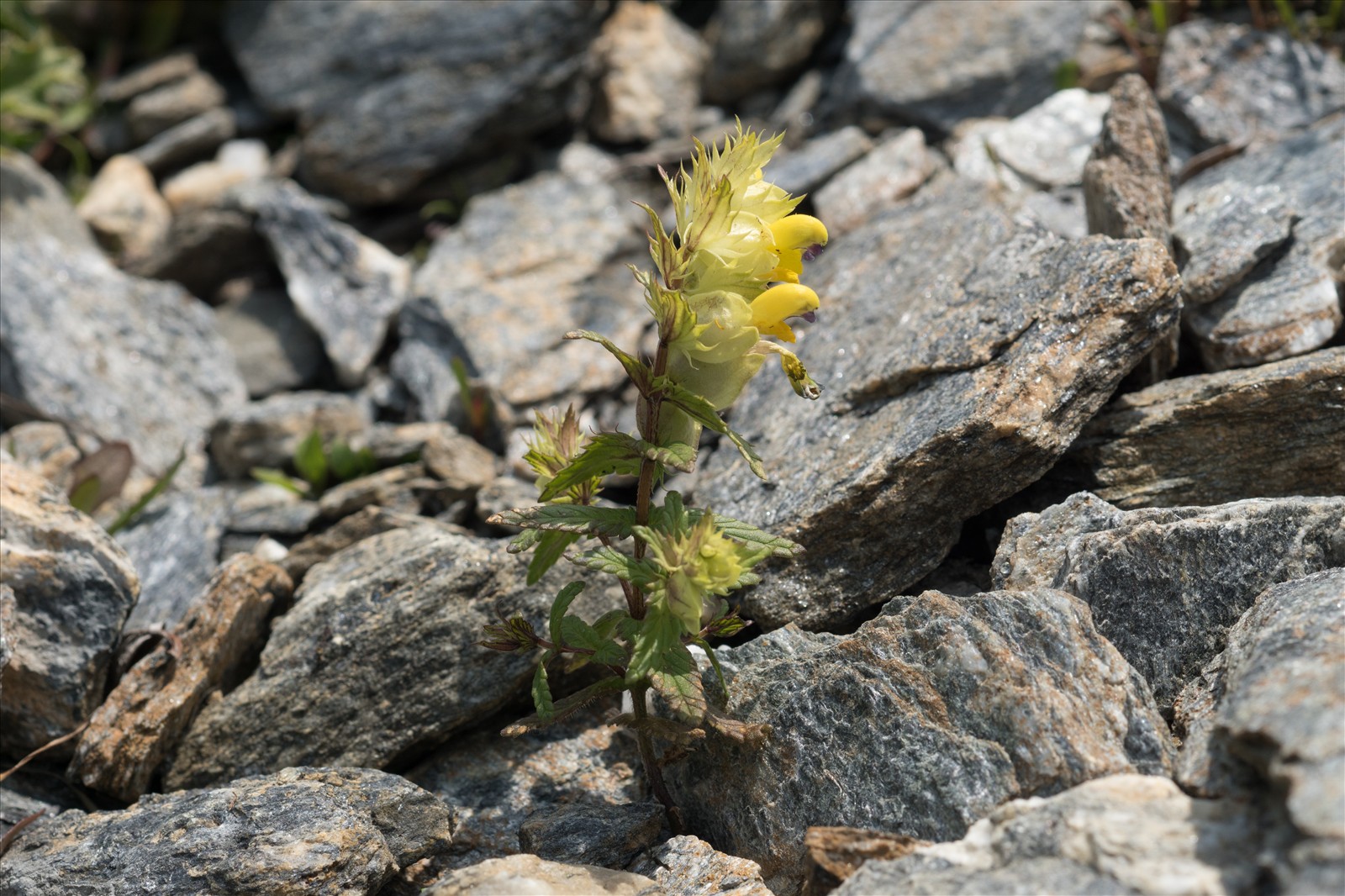 Plante annuelle de 8-30 cm, peu poilue, noircissant peu après la dessiccation ; tige ordinairement rameuse et sans feuilles intercalaires ; feuilles oblongues ou lancéolées, crénelées-dentées ; bractées glabres, blanchâtres, triangulaires, atténuées, à dents toutes aristées, décroissant brusquement vers le sommet ; calice glabre ; corolle jaune, longue de 13-18 mm, accrescente, à tube brusquement courbé en haut, à lèvres écartées et à gorge ouverte ; dents du casque étroitement coniques subaiguës, bleuâtres.