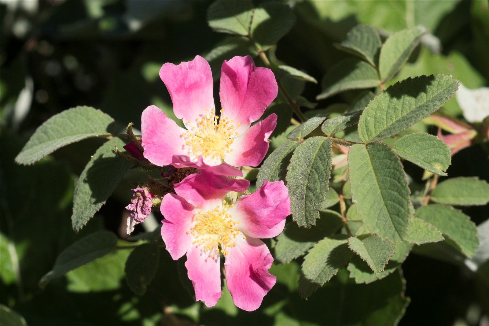 Arbrisseau de 40 cm à 1 mètre, à tiges et rameaux raides et droits ; aiguillons droits, grêles, à base étroite ; feuilles à 5-9 folioles grandes, ovales ou elliptiques, mollement velues-soyeuses sur les 2 faces, couvertes en dessous de glandes à odeur résineuse, à dents composées-glanduleuses ; stipules supérieures dilatées, à oreillettes falciformes-convergentes ; fleurs d'un rose vif, solitaires ou en corymbes ; pédicelles courts, hispides-glanduleux ; sépales presque entiers, glanduleux sur le dos, redressés et persistants jusqu'à la décomposition du fruit ; stigmates en tête velue-hérissée ; fruit gros, hispide.