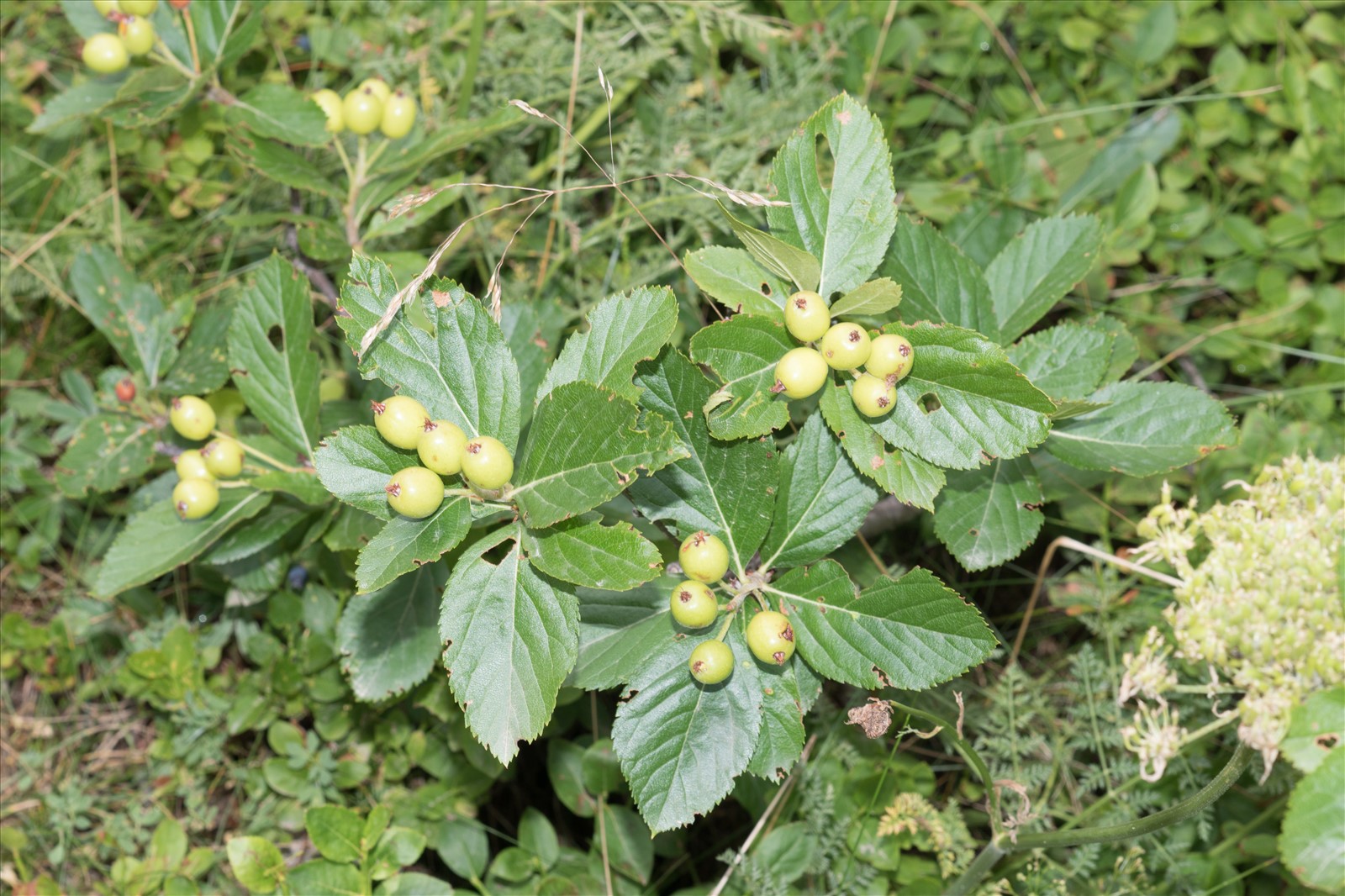 Petit arbrisseau de 50 cm à 1 mètre, à bourgeons glabrescents ; feuilles vertes et glabres sur les 2 faces, elliptiques-lancéolées, atténuées et entières à la base, finement et doublement dentées, à 5-8 paires de nervures secondaires peu saillantes ; pétiole presque nul ; fleurs roses en corymbes petits ; pétales oblongs, dressés ; 2 styles, libres, velus à la base ; fruit ovoïde, farineux-pulpeux, d'un rouge orangé à la maturité.