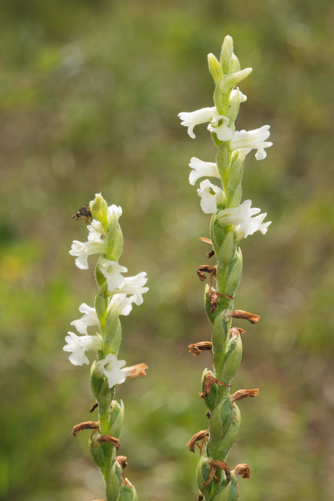 Plante vivace de 20 à 40 cm, glabre intérieurement, pubérulente au sommet, à tubercules allongés cylindriques en fuseau. Tige élancée, entourée à la base de 2 à 3 feuilles oblongues ou lancéolées-linéaires, pétiolées, développées, les caulinaires décroissantes en bractées. Fleurs blanches, peu odorantes, en épi spiralé étroit très serré pubérulent. Bractées lancéolées, dépassant l'ovaire. Labelle égalant les divisions lancéolées-linéaires en languette ovale-oblongue, à bords frangés, arrondie au sommet.
