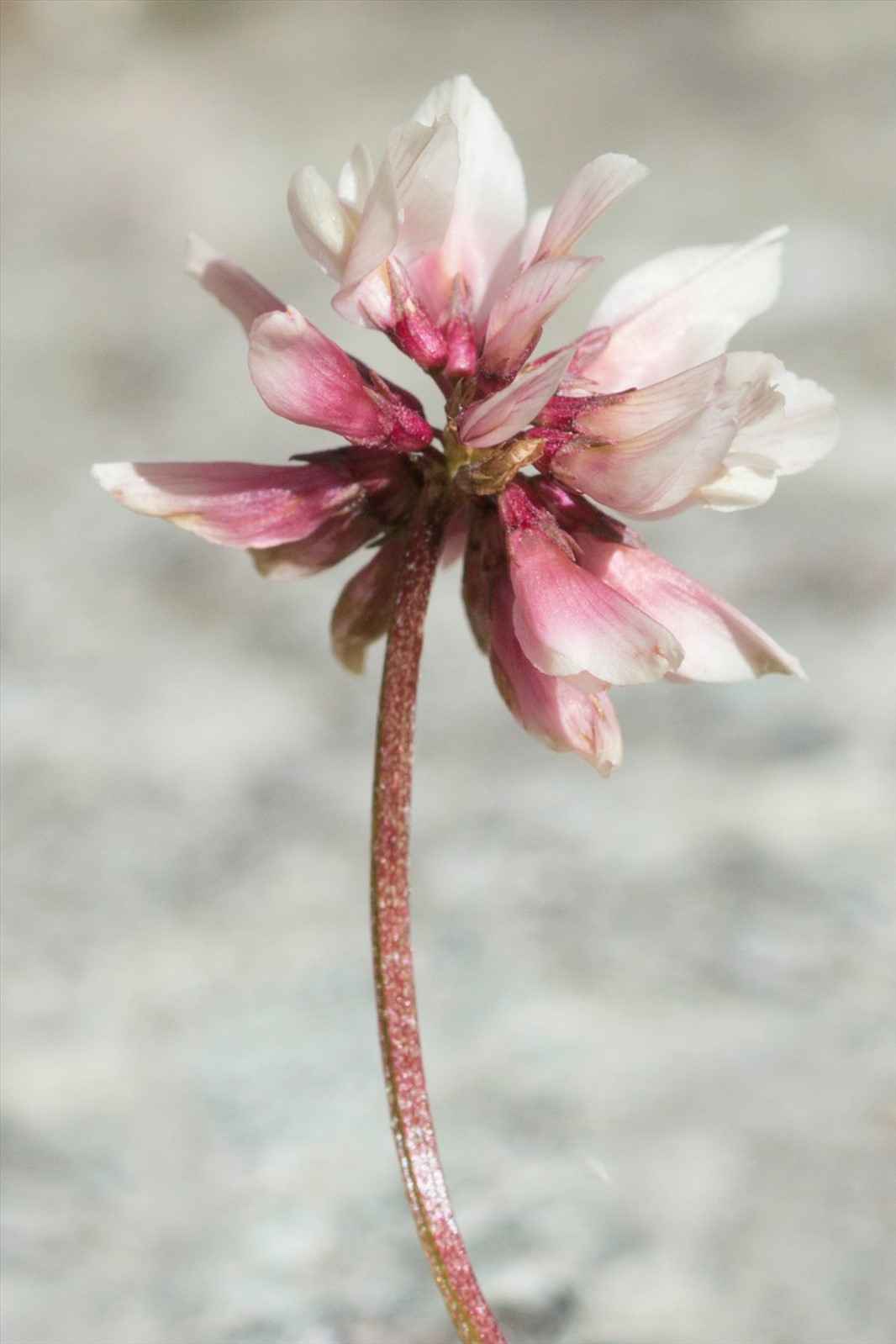 Plante vivace de 5-15 cm, glabre, gazonnante, couchée-ascendante, non radicante ; feuilles assez courtement pétiolées, à folioles obovales, nervées, denticulées tout autour ; fleurs d'un blanc jaunâtre ou rosé, de 6-8 mm de long, pédicellées, à la fin réfléchies, en têtes assez petites (12-18 mm de diam.), globuleuses ; pédoncules naissant de la tige au-dessus de sa base ; pédicelles plus longs que le tube du calice ; calice glabre, à dents inégales, les supérieures plus longues que le tube ; étendard 3 fois plus long que le calice ; gousse saillante, non bosselée, à 2 graines.