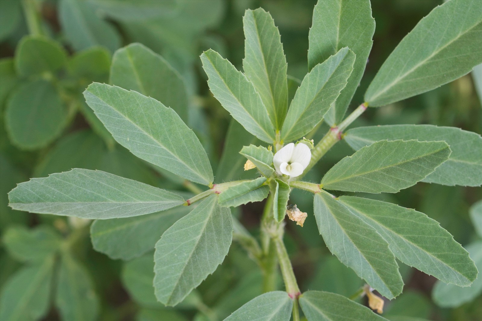 Plante annuelle de 10-40 cm, dressée, presque glabre ; feuilles pétiolées, à folioles grandes, obovales ou oblongues en coin, denticulées dans le haut ; stipules entières ; fleurs blanchâtres, assez grandes (12-15 mm de long), solitaires ou géminées, sessiles à l'aisselle des feuilles ; calice pubescent, à dents égales, plus courtes que le tube ; étendard plus long que les ailes et la carène obtuse ; gousse dressée, longue de 7-9 cm, linéaire, à peine arquée, glabrescente, à nervures longitudinales fines, terminée par un bec long de 2-3 cm ; 10-20 graines, ovoïdes, presque lisses, brunes ou rousses.