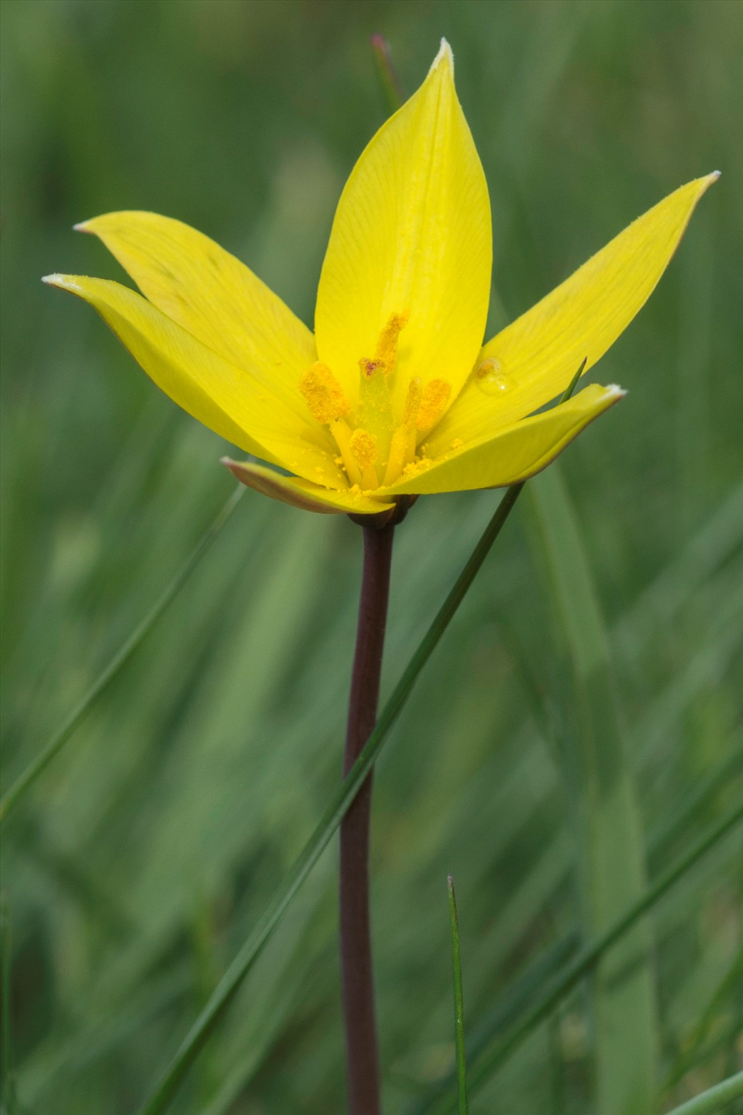 Plante vivace de 10-40 cm, grêle, à bulbe petit et glabre ; feuilles presque toujours 2, linéaires ou linéaires-lancéolées, n'atteignant pas la fleur ; fleur un peu penchée ou dressée, assez petite, jaune, rougeâtre en dehors ; périanthe long de 2-3 cm, en cloche, à divisions acuminées et glabres au sommet, presque égales, toutes lancéolées, ciliées ou glabrescentes à la base ; étamines à filets poilus à la base ; capsule subglobuleuse-trigone, courte (1-2 cm de long), presque aussi large que longue.