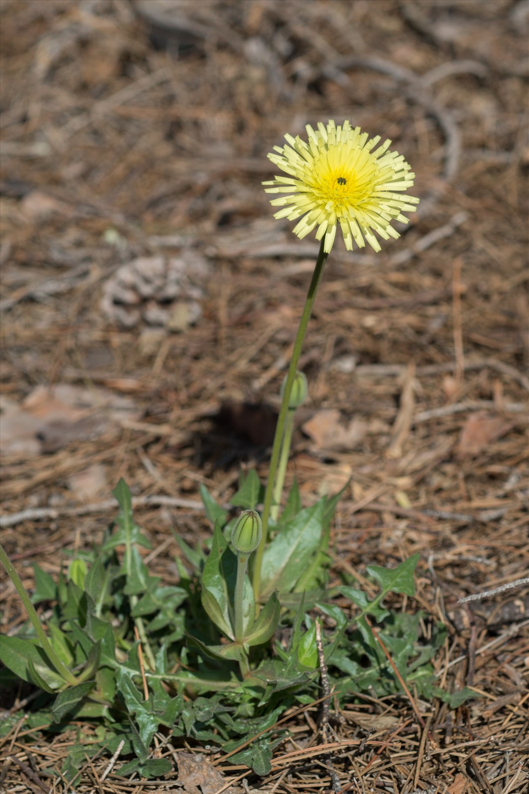 Souche grosse, vivace ; tige de 25-40 cm dressée, brièvement pubescente, simple ou rameuse inférieurement ; feuilles pubescentes, les inférieures roncinées-pennatipartites, les supérieures demi-embrassantes ovales ou lancéolées, entières, sinuées ou pennatifides ; pédoncules très longuement nus, terminés par un grand capitule solitaire ; involucre à folioles lancéolées, mollement tomenteuses ; akènes tuberculeux surmontés d'un bec creux et scabre, insensiblement rétréci dès la base faiblement dilatée au sommet ; aigrette d'un blanc-roussâtre ; fleurs d'un jaune soufré.
