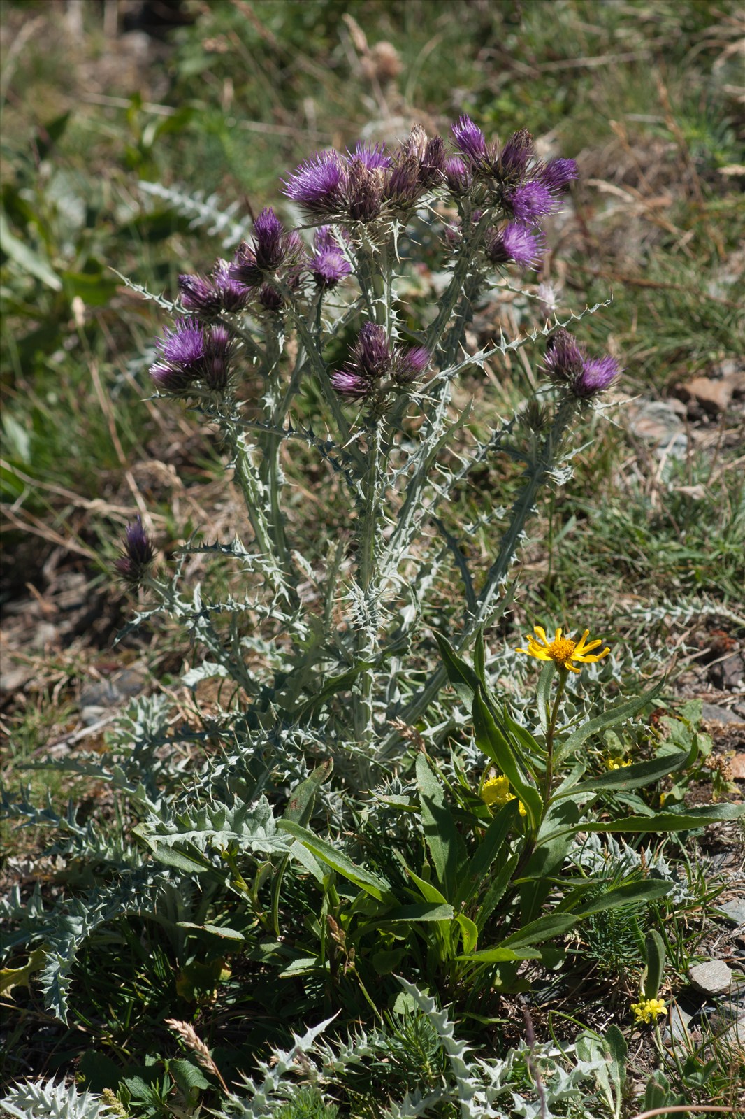 Plante vivace à tige de 15-40 cm, dressée, blanche-tomenteuse, très rameuse, largement ailée, très épineuse et feuillée jusqu'au sommet ; feuilles longuement décurrentes, blanches-tomenteuses en dessous, blanchâtres, laineuses en dessus, étroitement oblongues, pennatipartites à segments courts, lobés, épineux ; capitules médiocres sessiles ou subsessiles, rapprochés en corymbe assez dense ; involucre ovoïde, aranéeux à folioles lâchement dressées, les moyennes et les intérieures assez largement linéaires-lancéolées, atténuées en pointe fine et aiguë, non piquante ; fleurs purpurines.