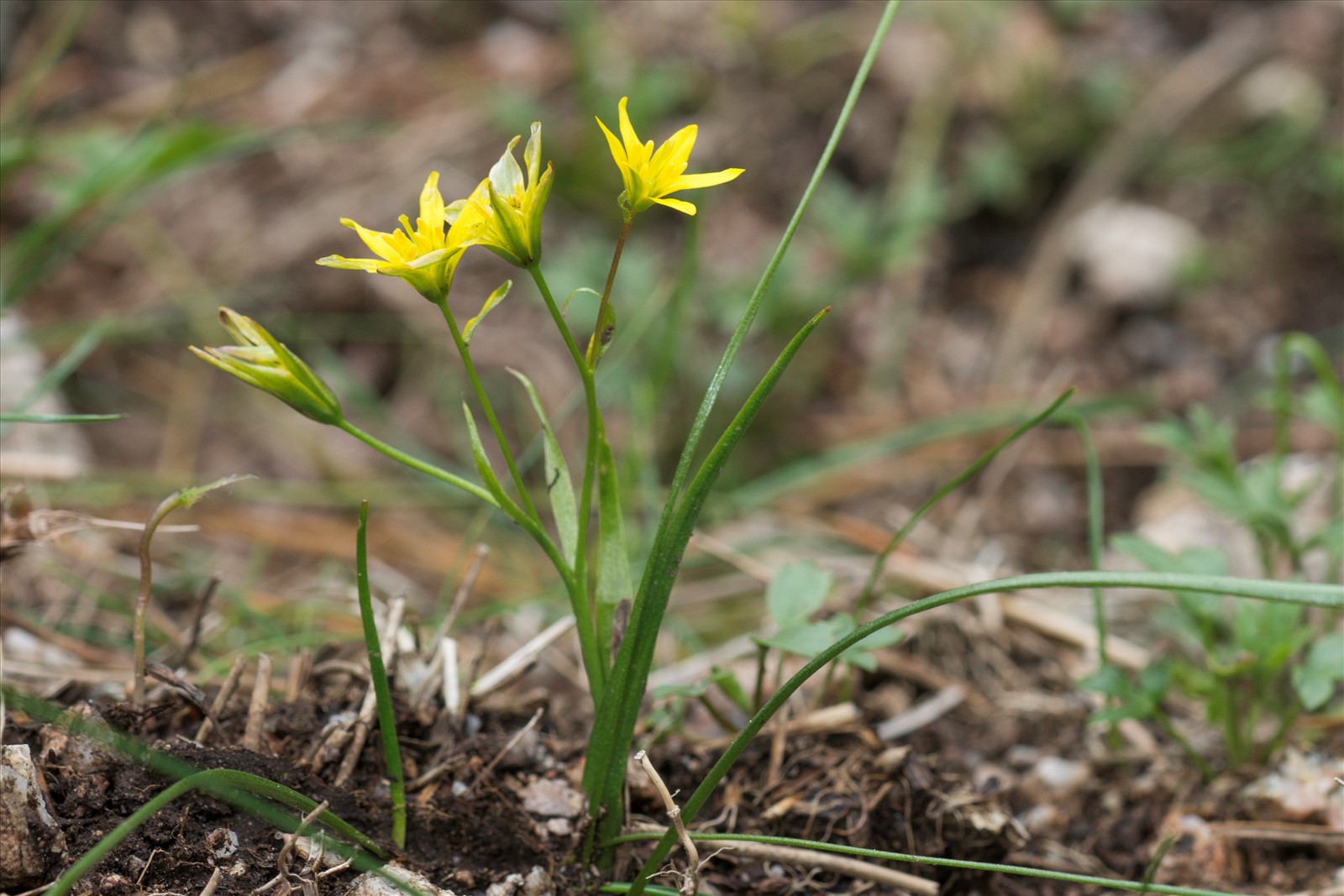 Plante vivace de 5-15 cm, glabrescente, à 2 bulbes dressés, renfermés dans une tunique commune ; tige naissant entre les 2 bulbes, portant 2-5 feuilles alternes et distantes ; feuilles radicales 2, filiformes, presque planes, les caulinaires lancéolées-acuminées, glabres ou ciliées, embrassantes et sans bulbilles à la base ; fleurs 1-5 en corymbe, à pédicelles naissant à différentes hauteurs, glabres, capillaires, bien plus minces que la tige ; périanthe de 10 mm, glabre, à divisions lancéolées-aiguës, d'un tiers plus longues que les étamines.