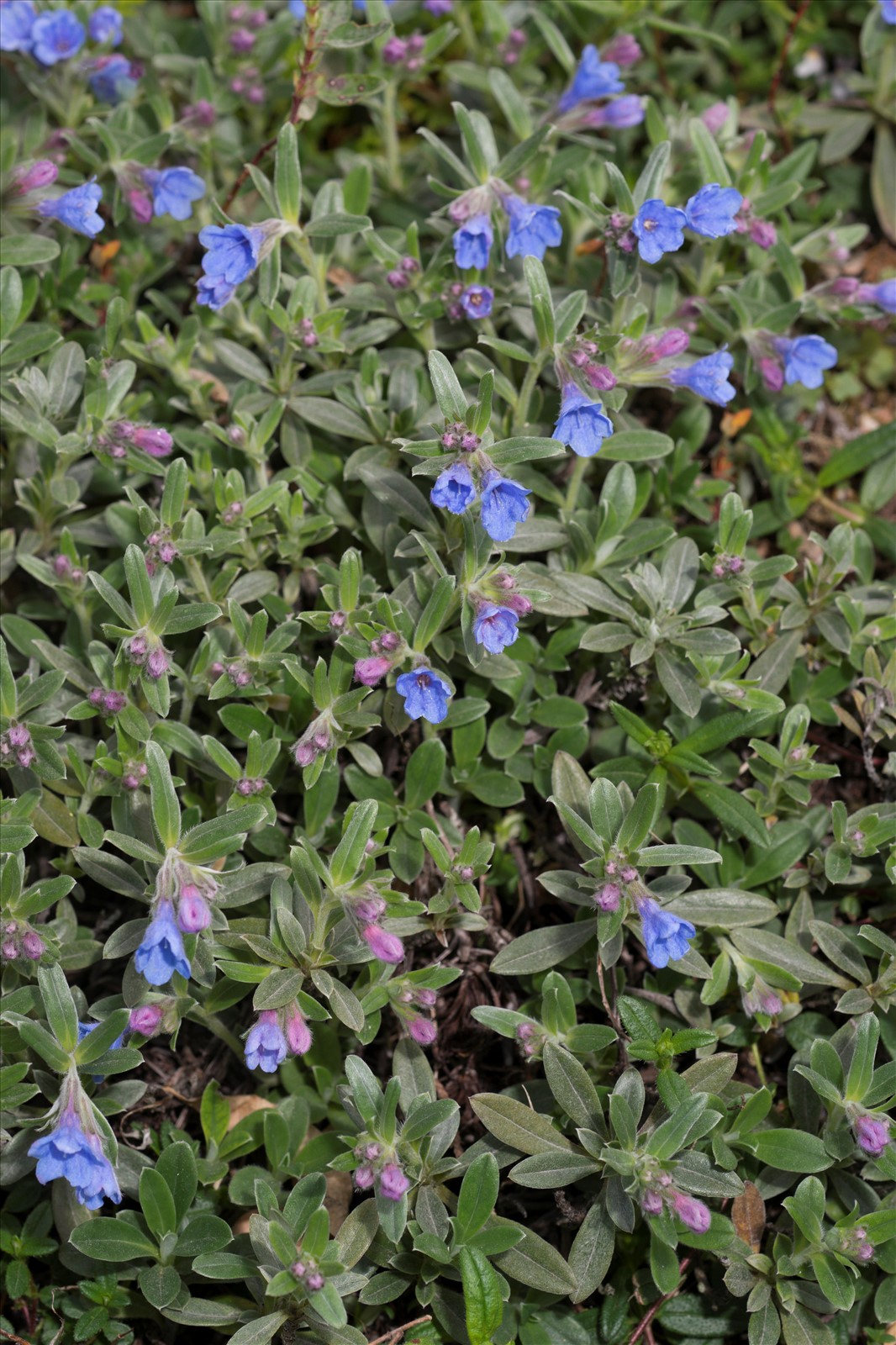 Petit sous-arbrisseau de 10-30 cm, d'un vert-blanchâtre, à tiges grêles, sous-ligneuses, diffuses-ascendantes, rameuses, longuement nues à la base ; feuilles alternes ou fasciculées au sommet des rameaux, les plus grandes larges de 1 cm, obovales ou oblongues, atténuées en pétiole, planes, uninervées, vertes et pubérulentes en dessus, soyeuses-blanchâtres en dessous ; fleurs bleues ou violacées, assez grandes, subsessiles, en grappes très courtes ; calice velu-blanchâtre, à lobes linéaires ; corolle de 15-20 mm, laineuse-pubescente en dehors, glabre à la gorge, 2 fois aussi longue que le calice ; étamines saillantes, insérées à la gorge ; stigmate bilobé ; carpelles blancs, lisses, ovoïdes, acuminés-obtus.