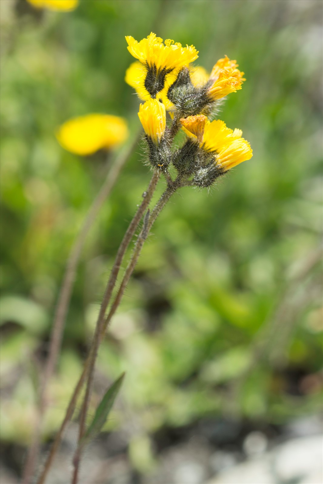Souche vivace rampante sans stolons ou à stolons très courts ; tige de 5-20 cm dressée-ascendante, brièvement farineuse, blanchâtre et glanduleuse, ordinairement dépourvue de soies, nue ou offrant une seule feuille ; feuilles étroites, oblongues-lancéolées plus ou moins hérissées de soies, pourvues en dessous de poils étoiles ou presque glabres ; capitules au nombre de 3-7 en petite cyme ombellée ; involucre ovoïde hérissé de longs poils fins entremêlés ou non de quelques glandes ; fleurs jaunes.
