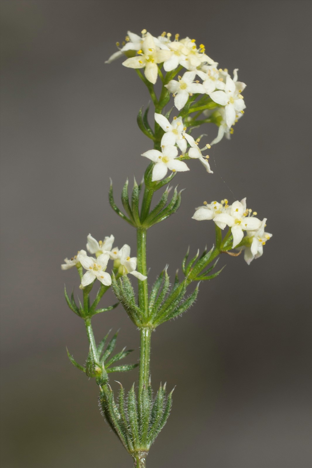 Plante vivace de 5-12 cm, d'un vert luisant, souvent velue, ne noircissant pas, densément gazonnante ; tiges grêles, redressées, un peu rigides, à entrenoeuds courts ; feuilles verticillées par 6-7, rapprochées, linéaires en alêne, longuement aristées, rudes aux bords, à nervure dorsale épaisse et saillante ; fleurs blanches, en panicule courte, corymbiforme, à rameaux dépassant un peu les feuilles supérieures ; corolle à lobes aigus ; fruits glabres, presque lisses.