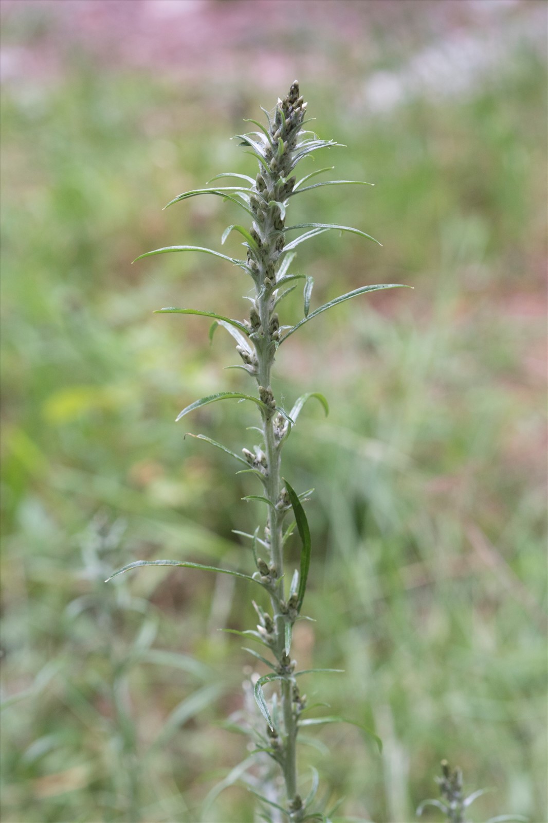 Plante vivace à tiges de 2-6 dm dressées ou ascendantes, simples, solitaires ou peu nombreuses, blanches-tomenteuses ; feuilles caulinaires sessiles, décroissantes, étroitement oblongues-linéaires, uninervées, blanches-tomenteuses en dessous, vertes ou verdâtres en dessus, les inférieures et celles des rosettes plus larges, longuement atténuées à la base ; involucre à folioles scarieuses, bordées de brun ; capitules en grappe raide, très allongée ou en panicule spiétroite, réunis en fascicules peu fournis à l'aisselle des feuilles linéaires, très étroites, qui les accompagnent jusqu'au sommet.