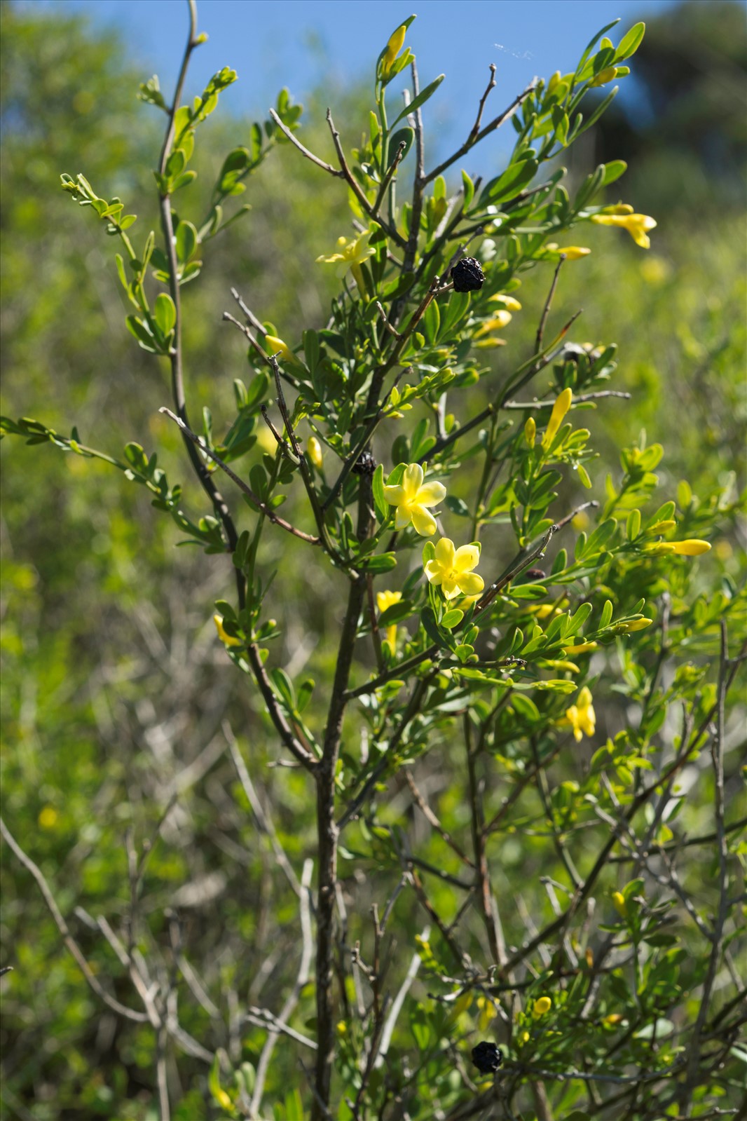 Sous-arbrisseau de 30 cm à un peu plus d'un mètre, dressé, à tiges et rameaux raides, anguleux, cassants, verts, glabres. Feuilles alternes, pétiolées, simples ou trois folioles obovales ou oblongues, obtuses entières, épaisses, luisantes. Fleurs jaunes, odorantes, brièvement pédonculées, 1 à 4 au sommet des rameaux. Calice vert, à lobes linéaires-obtus, atteignant à peine la moitié du tube de la corolle. Corolle en entonnoir, à limbe plan. Baie globuleuse, noire et luisante.