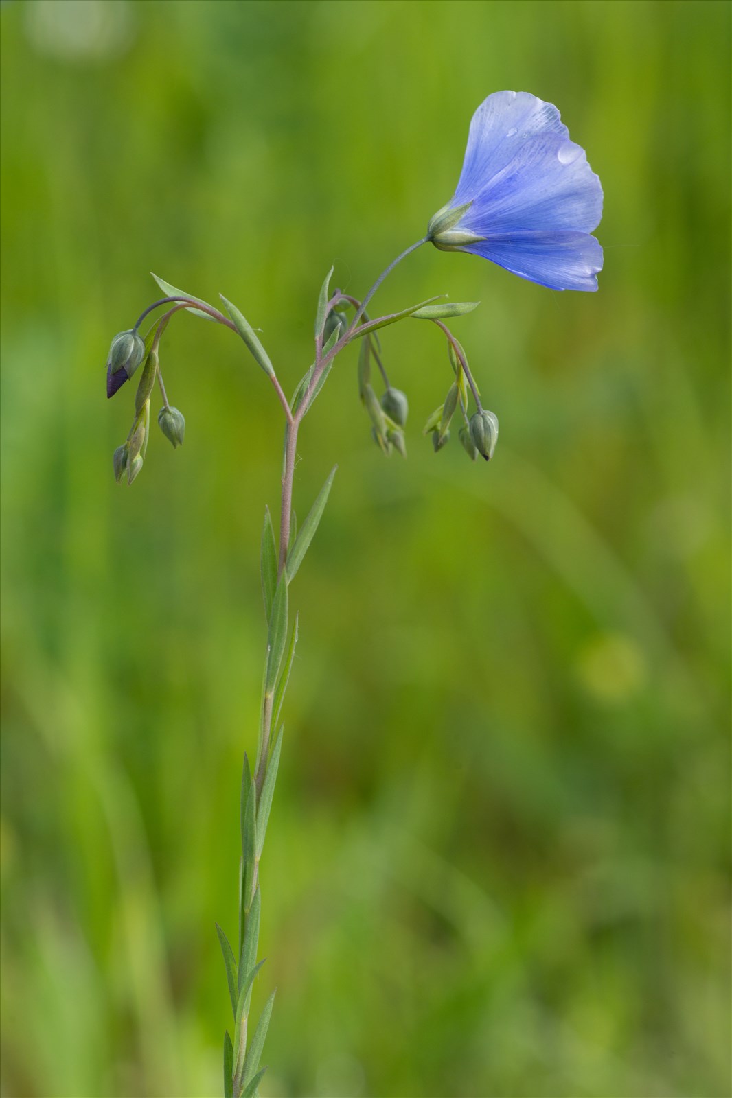 Plante toujours annuelle, glabre ; tige de 40-80 cm, ordinairement solitaire, dressée dès la base ; feuilles lancéolées, à 3 nervures ; fleurs d'un bleu vif, grandes ; sépales non ciliés ; pétales 3 fois plus longs que les sépales ; anthères oblongues, 3-4 fois plus longues que larges ; stigmates en massue ; capsule large de 7-9 mm à cloisons glabres ; graines longues d'environ 5 mm luisantes, apiculées en bec.