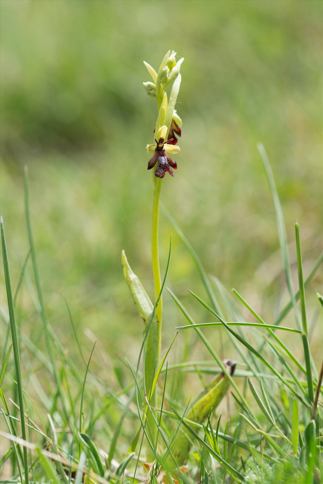 Plante vivace de 20-50 cm, élancée, glabrescente, à tubercules globuleux ou ovoïdes ; feuilles oblongues ; bractées dépassant l'ovaire ; fleurs 2-8, petites, espacées, en long épi grêle ; divisions extérieures verdâtres, oblongues, étalées en croix, les 2 intérieures linéaires-filiformes, brun pourpre, veloutées ; labelle plus long que les divisions extérieures, obovale-oblong, brun pourpre velouté, marqué au centre d'une tache bleuâtre glabre presque carrée, trilobé vers le milieu, les lobes latéraux oblongs-étroits, le moyen grand bilobé ; gynostème obtus, sans bec.