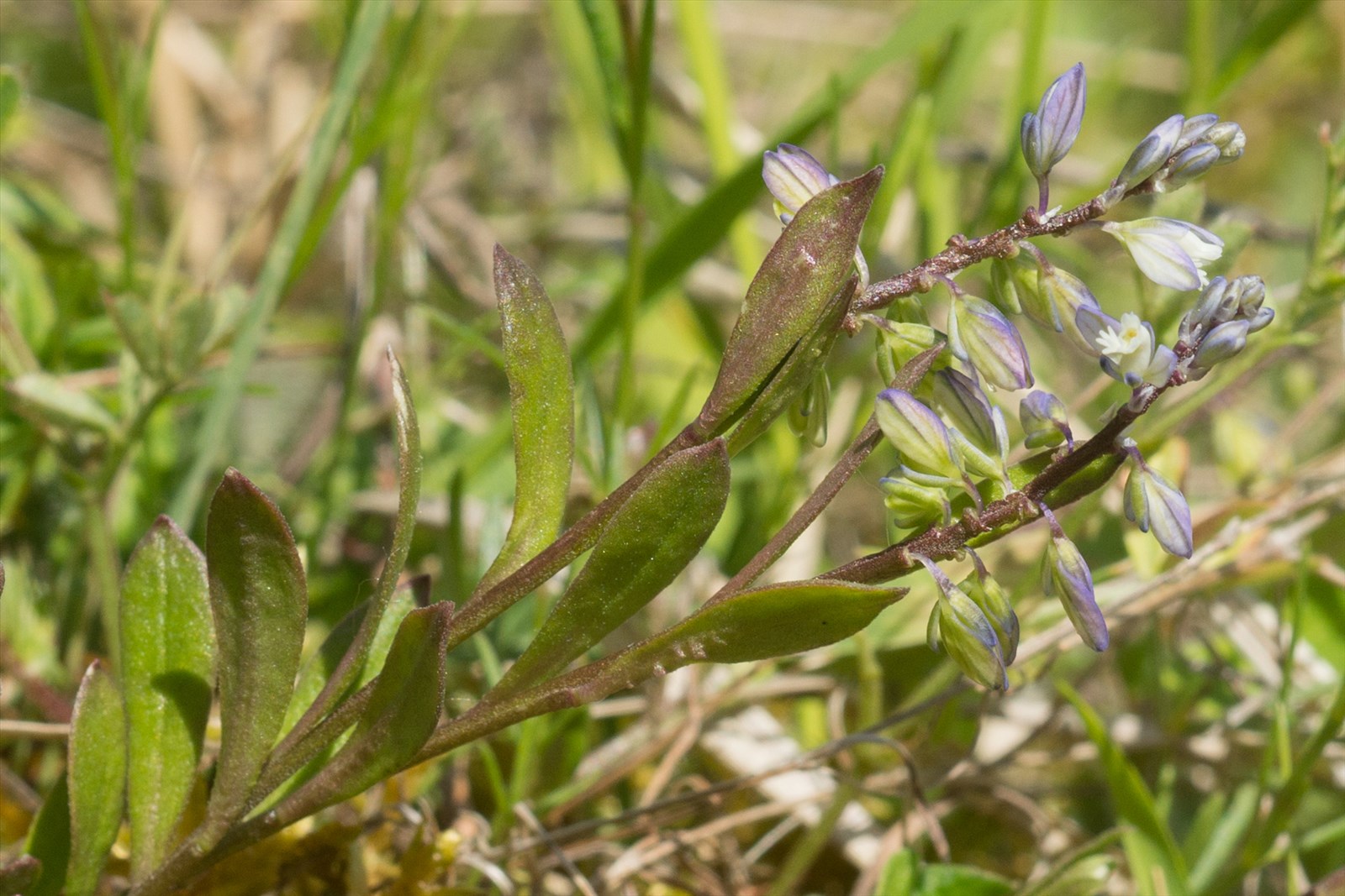 Plante vivace à racine grêle, à saveur amère ; tiges de 8-20 cm, assez épaisses, étalées et feuillées à la base ; feuilles inférieures grandes, obovales, en rosette, sans pousse stérile au centre, celles des rameaux fleuris plus petites, lancéolées ; fleurs d'un bleu pâle ou blanchâtres, petites, en grappes terminales, à la fin allongées et lâches ; bractées toutes plus courtes que le pédicelle ; ailes de 3-5 mm à 3 nervures à peine ramifiées ; capsule petite, plus longue et plus large que les ailes.