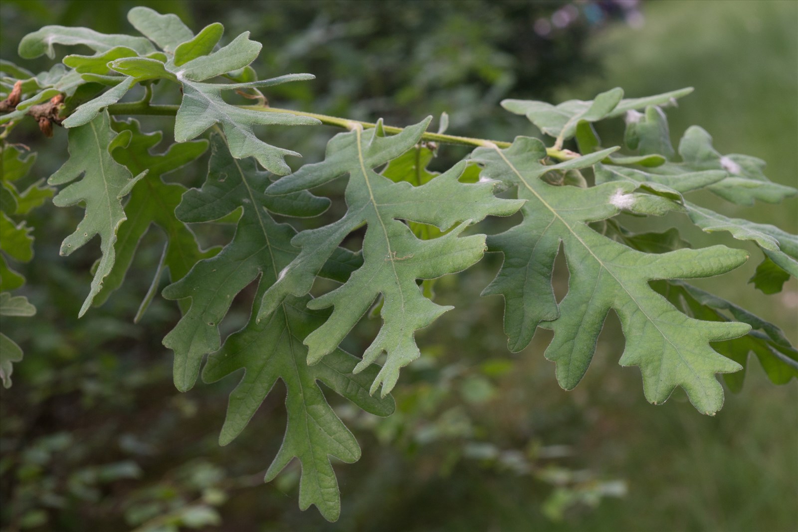Arbre peu élevé, souvent tortueux, à racine traçante et très drageonnante ; jeunes pousses blanc-argenté lavé de rose; feuilles courtement pétiolées, fermes, caduques, obovales-oblongues, sinuées-lobées ou pennatifides, d'abord tomenteuses-blanchâtres, à la fin vertes et pubescentes en dessus, mollement veloutées en dessous ; chatons mâles assez denses ; fruits sessiles ou pédoncules, sur les ramules feuilles de l'année ; cupule hémisphérique, grise-tomenteuse, à écailles lâchement appliquées et un peu ouvertes au sommet.