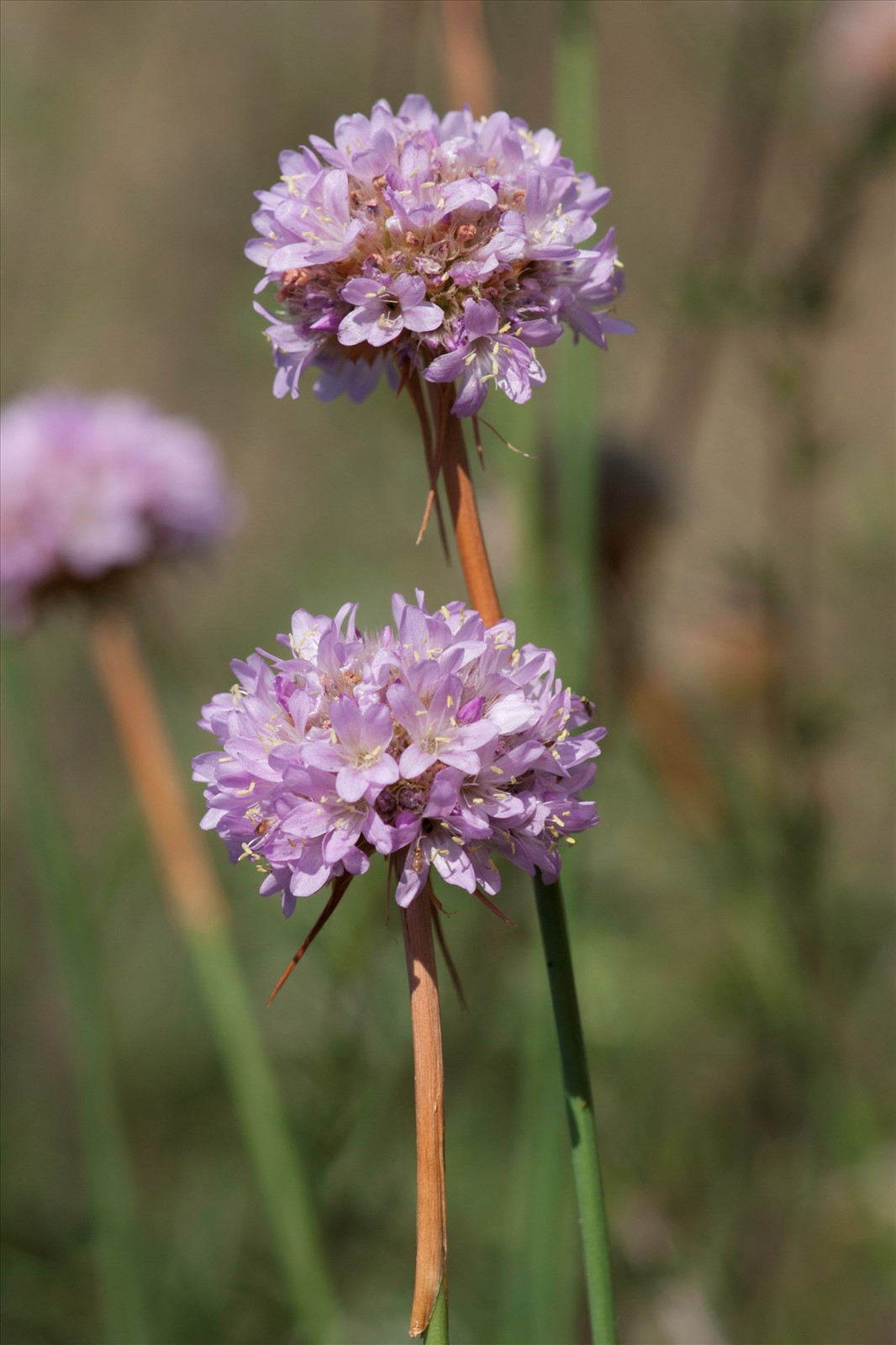 Plante vivace de 20-60 cm, glabre, gazonnante ; feuilles un peu fermes, linéaires-lancéolées ou lancéolées, acuminées, planes, à 3-7 nervures ; hampes fortes ; gaîne allongée (2-4 cm), 2-4 fois plus longue que le capitule subglobuleux large d'environ 2 cm ; fleurs roses ; involucre fauve, à folioles plurisériées, les extérieures triangulaires-lancéolées, acuminées en pointe égalant presque ou dépassant les fleurs ; bractéoles égalant le fruit ; calice à tube égalant le pédicelle, à côtes aussi larges que les sillons, à lobes ovales-lancéolés, atténués en arête aussi longue qu'eux. Plante polymorphe.