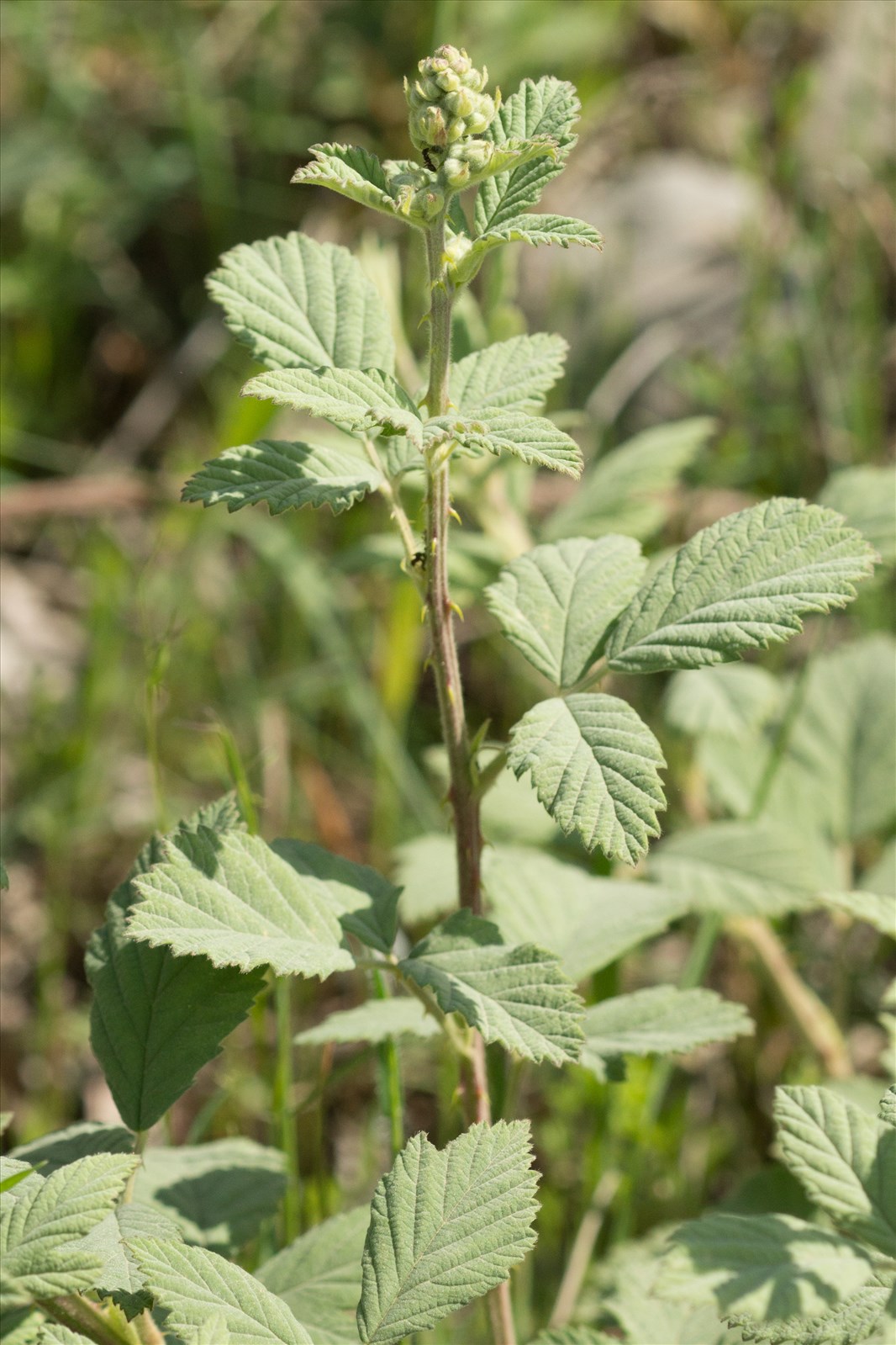 Turion faible, canaliculé sur les faces, glabre ou pubescent, aciculé-glanduleux, à aiguillons petits, falciformes ; feuilles finement tomenteuses-veloutées et blanches en dessous, à 3-5 folioles grossièrement dentées, la terminale obovale-rhomboïdale, simplement aiguë ; rameau florifère grêle, anguleux, garni de petits aiguillons crochus ; inflorescence allongée, étroite, plus ou moins aciculée-glanduleuse, à pédoncules ascendants ; sépales tomenteux ; pétales d'un blanc jaunâtre, obovales-oblongs ; étamines blanches, égalant les styles.