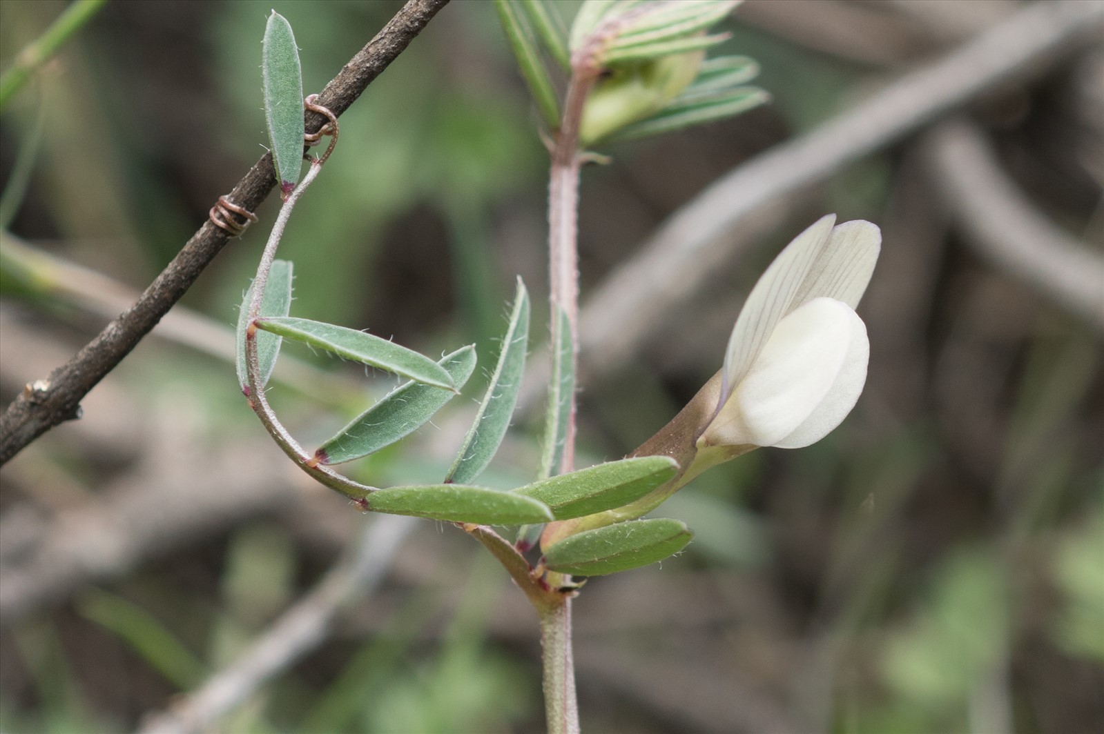 Plante annuelle de 20-50 cm, peu velue, grêle, grimpante ; feuilles à 5-7 paires de folioles linéaires-oblongues, obtuses et mucronées ; vrilles rameuses ; stipules entières ou bilobées ; fleurs d'un jaune pâle ou teintées de violet, grandes, axillaires, solitaires ou géminées, subsessiles ; calice glabre, en cloche, à dents très inégales, les 2 supérieures courtes et conniventes, l'inférieure plus longue que le tube ; étendard très glabre ; gousse de 25-30 mm sur 8-9, oblongue, stipitée, hérissée de poils blancs renflés-tuberculeux à la base, pendante et noirâtre à la maturité; graines globuleuses.