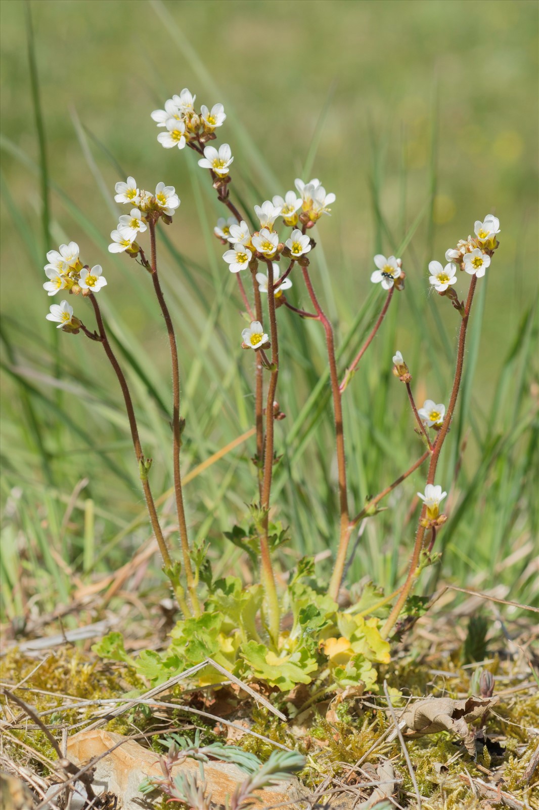 Plante bisannuelle de 20 à 50 cm, pubescente-visqueuse, à racine produisant des bulbilles nombreux, non squameux ; tige robuste, dressée, ordinairement simple, portante ; feuilles palmatilobées à 3 à 8 lobes ; feuilles radicales en rosette, arrondies en rein, incisées-crénelées, longuement pétiolées ; fleurs blanches, grandes (12 à 13 mm de long), en cloche, odorantes, en corymbe très lâche ; pédicelles fructifères égalant environ le calice ; sépales ovales ; pétales obovales en coin, 3 fois plus longs que les sépales ; capsule saillante.