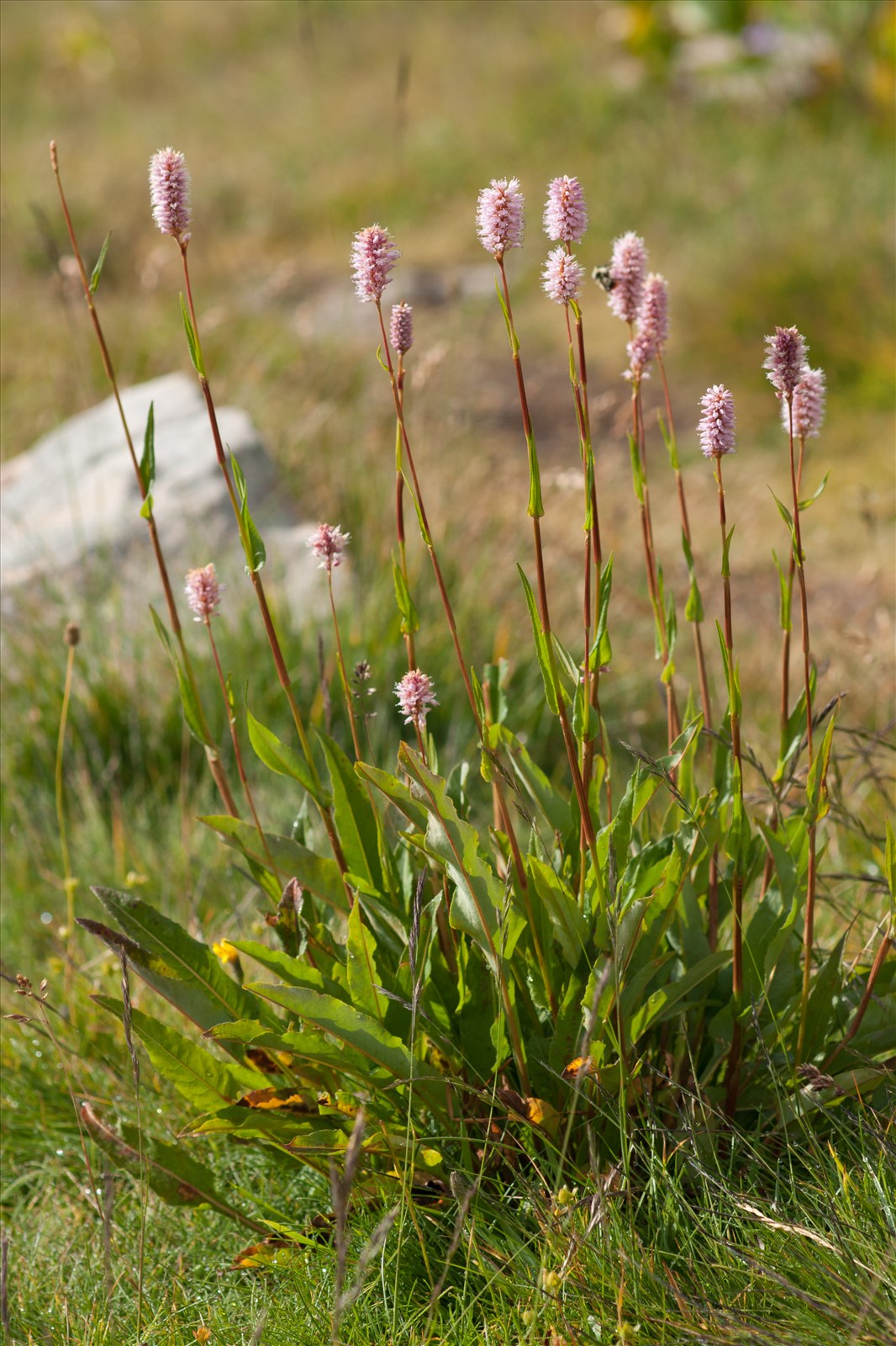 Plante vivace de 20-80 cm, glabrescente, à souche épaisse contournée ; tige dressée, simple, peu feuillée ; feuilles glauques-pubérulentes en dessous, à bords rudes non roulés, les inférieures largement oblongues obtuses, à limbe brusquement rétréci et décurrent sur le pétiole, les supérieures acuminées, sessiles-embrassantes, à longue gaine non ciliée ; fleurs roses, en épi terminal oblong-cylindrique et compact ; 8 étamines saillantes ; 3 styles libres ; fruits de 4-5 mm, trigones à angles tranchants, brun luisant.
