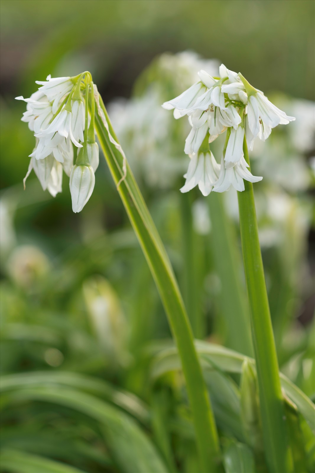 Plante vivace de 20-50 cm, glabre, à forte odeur d'ail, à bulbe petit ovoïde blanchâtre ; tige un peu épaisse, triquètre à 3 angles aigus, munie au-dessus de la base de 2-3 feuilles larges de 5-10 mm, planes, glabres, égalant à peu près la tige ; spathe à 2 valves lancéolées-acuminées, plus courtes que les pédicelles ; fleurs blanches, grandes, penchées, unilatérales, en ombelle lâche ; pédicelles inégaux, épaissis au sommet, 1-2 fois plus longs que la fleur ; périanthe cylindracé, à divisions oblongues-lancéolées aiguës, à la fin conniventes ; étamines incluses ; stigmate trifide.