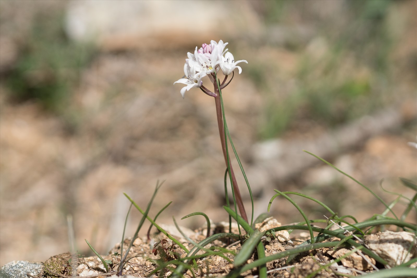 Plante vivace de 5-20 cm, glabre, à bulbe petit, ovoïde ; feuilles linéaires-étroites (1-2 mm), égalant ou dépassant la tige très grêle ; fleurs violet-lilas, rosées ou blanches, inodores, dressées, 2-6 en petite grappe courte et serrée en corymbe ; pédicelles dressés, les inférieurs plus longs et les autres plus courts que le périanthe et que la bractée lancéolée-acuminée entière ; périanthe de 6-7 mm, un peu renflé sur l'ovaire, à lobes oblongs, étalés, plus longs que le tube ; filets 2 fois plus longs que l'anthère elliptique ; style 2-3 fois plus long que l'ovaire.