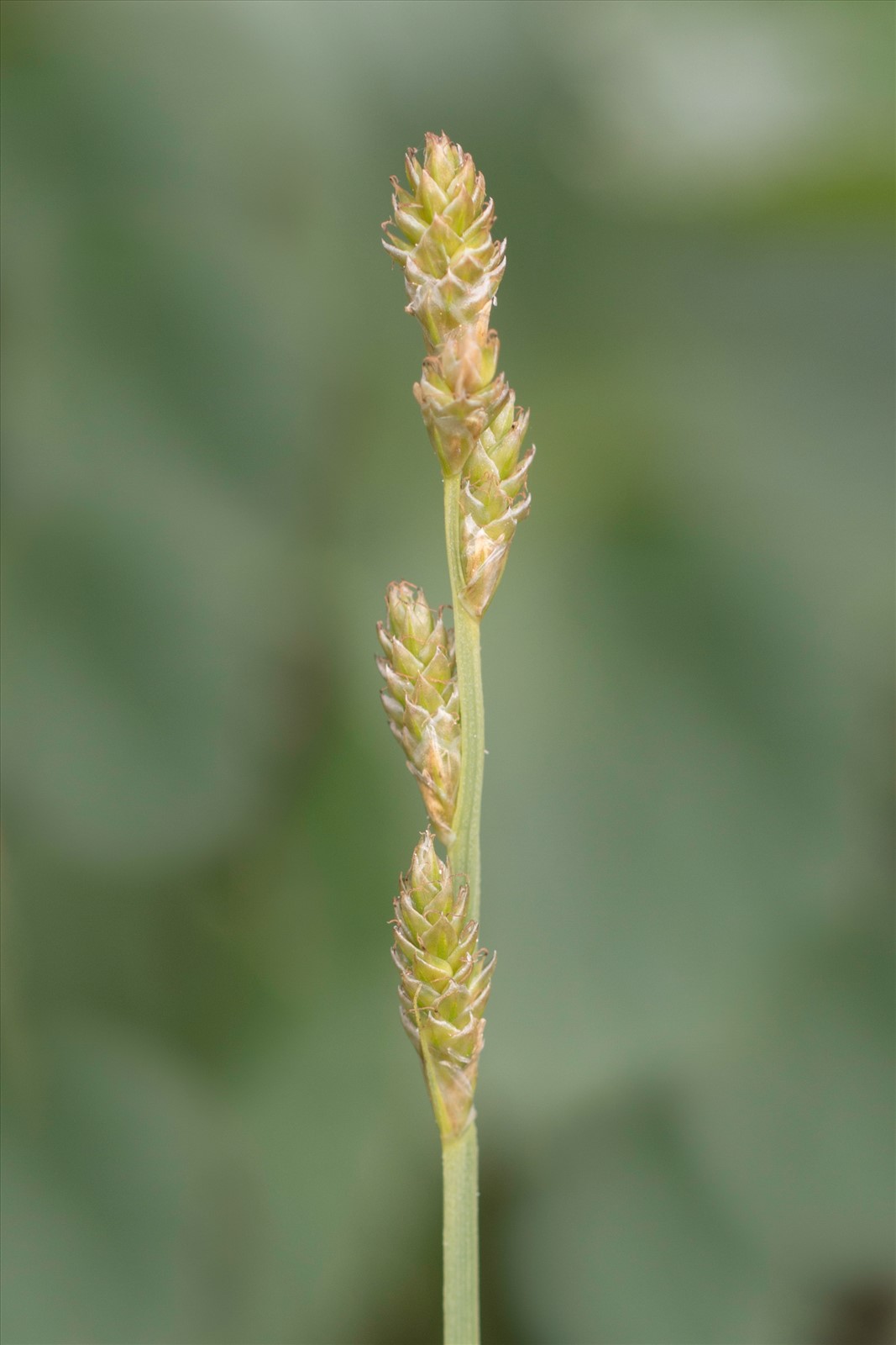 Plante vivace de 20 à 60 cm, glabre, à souche gazonnante ; tige grêle, triquètre et rude au sommet ; feuilles d'un vert glauque, égalant presque la tige, étroites (2 à 3 mm), rudes ; inflorescence en épi oblong, blanchâtre, formé de 4 à 7 épillets ovoïdes, mâles à la base, un peu écartés, dressés ; bractées scabieuses ; écailles ovales-aiguës ; 2 stigmates ; utricules dressés, verdâtres, ovales-lancéolés (2,5 mm), plans-convexes, finement nervés, atténués en bec court et tronqué dépassant un peu l'écaille.