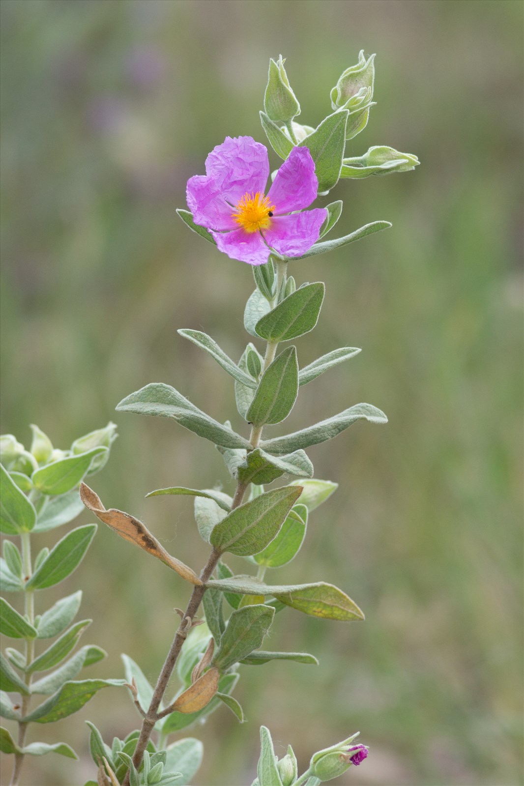 Sous-arbrisseau de 40 cm à 1 mètre, peu odorant, tomenteux-blanchâtre ; feuilles sessiles, demi-embrassantes, non connées, oblongues-elliptiques, planes, entières sur les bords, très tomenteuses sur les 2 faces ; fleurs de 4-6 cm, rouges, pédonculées, 1-4 en ombelle au sommet des rameaux ; sépales 3, largement ovales-acuminés, velus ; pétales 2-3 fois plus longs que le calice ; style égalant les étamines ; capsule ovoïde, velue, plus courte que le calice, à 3 loges ; graines lisses.