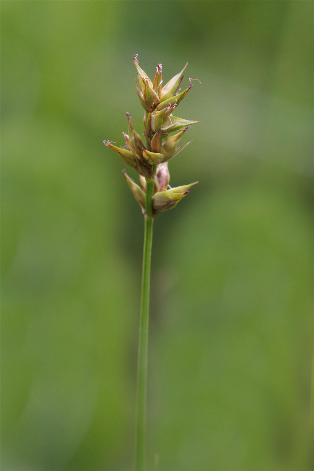 Plante vivace de 30 à 80 cm, glabre, à souche gazonnante ; tige assez grêle, triquètre, à faces planes, scabre au sommet ; feuilles larges de 2 à 3 mm, scabres ; ligule à partie soudée au limbe ovale-lancéolée, à bord antérieur tronqué en ligne droite et dépassant la naissance du limbe ; inflorescence en épi oblong, dense ou un peu lâche à la base, vert fauve, formé de 4 à 9 épillets subglobuleux mâles au sommet ; bractées sétacées ; écailles ovales-mucronées ; 2 stigmates ; utricules à la fin étalés en étoile, verdâtres, ovales-lancéolés (5 mm), plans convexes à base épaissie, presque lisses, à long bec bifide dépassant l'écaille ; akène aussi large que long.