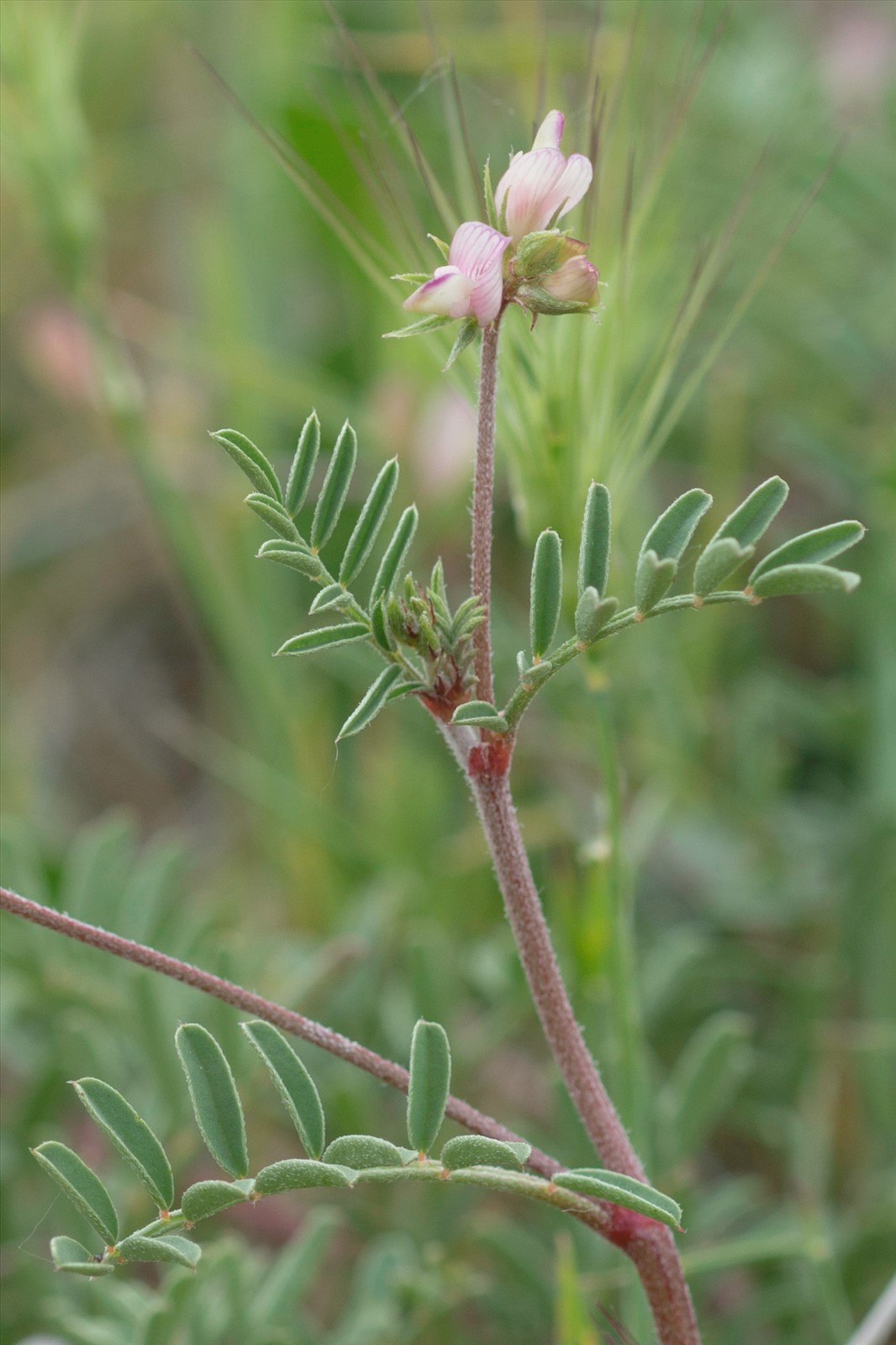 Plante annuelle de 5-40 cm, velue-blanchâtre, couchée ou ascendante, à racine grêle ; feuilles petites à 5-8 paires de folioles ovales ou linéaires, tronquées ou échancrées, mucronées, pubescentes en dessous ; stipules libres, lancéolées-acuminées ; fleurs roses, assez grandes (8-12 mm), 3-8 rapprochées en grappes très courtes, ombelliformes, sur des pédoncules plus longs que la feuille; pédicelles plus courts que le tube du calice ; calice à gorge coupée transversalement, à dents plus longues que le tube ; étendard plus long que les ailes et dépassant un peu la carène ; gousses à 2-4 articles arrondis, hérissées d'aiguillons crochus, velus, à bords non ailés ; graines luisantes.