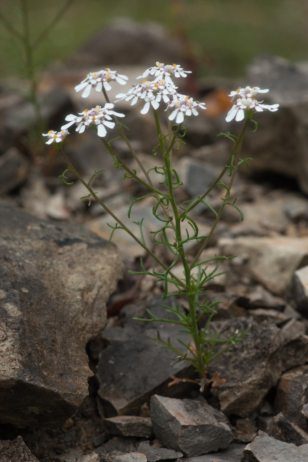 Plante annuelle, pubescente. Tige de 10 à 25 cm, dressée, rameuse au sommet. Feuilles pennatiséquées, divisées au sommet en 2 à 5 lobes linéaires, obtus. Fleurs blanches ou lilacées, assez grandes. Pétales contractés en onglet court. Grappe fructifère courte, en corymbe dense, à pédicelles dressés ; silicules presque aussi carrées, aussi larges au sommet qu'au milieu, à échancrure assez profonde, à lobes obtus et divergents ; style égalant ou dépassant les lobes.
