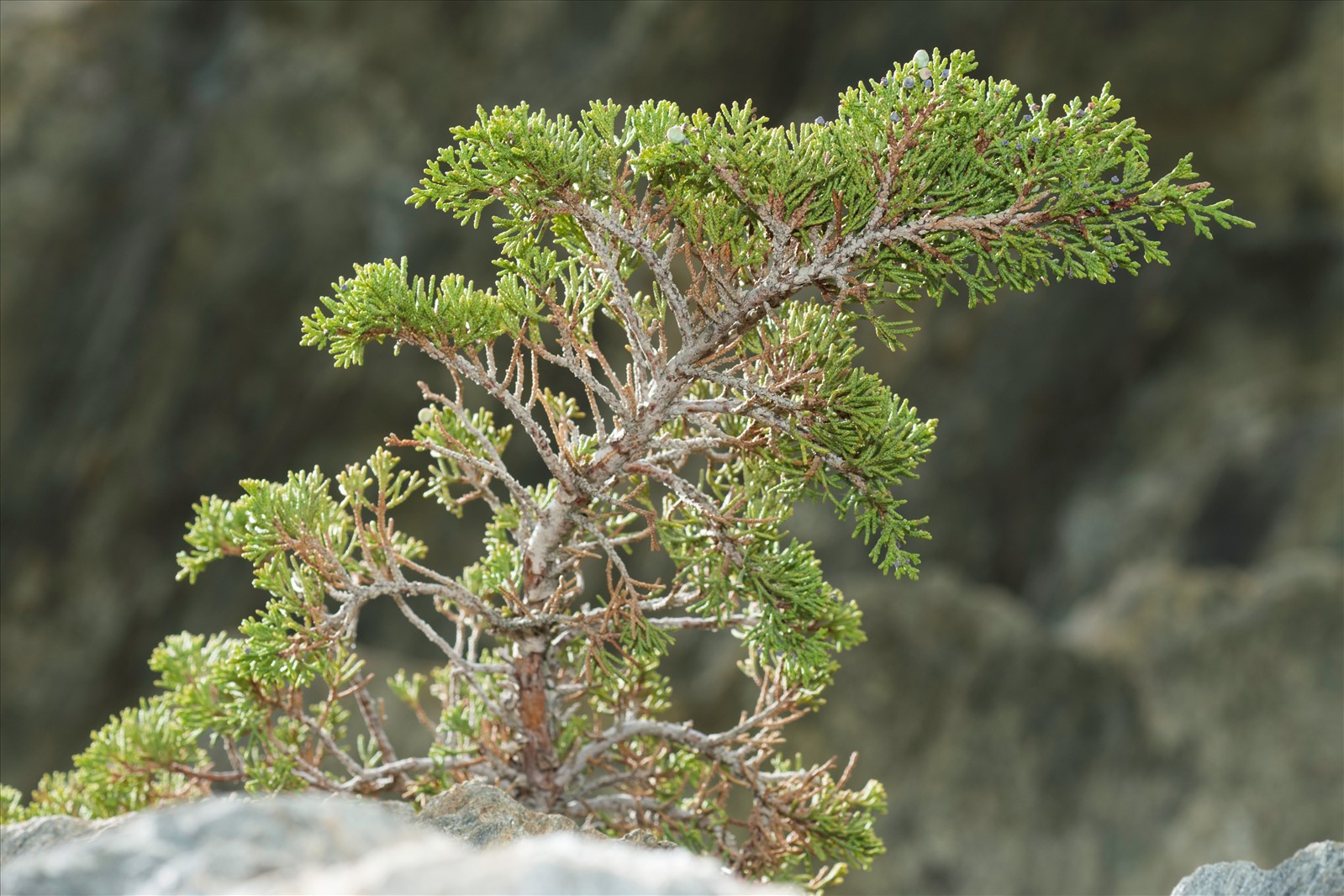 Arbrisseau touffu dépassant rarement 1 à 4 m, à écorce gris brun, bourgeons nus, rameaux subcylindriques ; feuilles petites, lâchement imbriquées sur 4 à 6 rangs, rhomboïdales, convexes et glanduleuses sur le dos celles des jeunes rameaux, libres et étalées linéaires-lancéolées, piquantes, d'un vert sombre ; fleurs généralement monoïques ; fruits bleuâtres et glauques à la maturité, réfléchis, ovoïdes-globuleux, petits, ne dépassant pas 5 mm, à chair très résineuse assez molle ; graines 3 à 4, petites, ovales-elliptiques, ruguleuses, non striées.