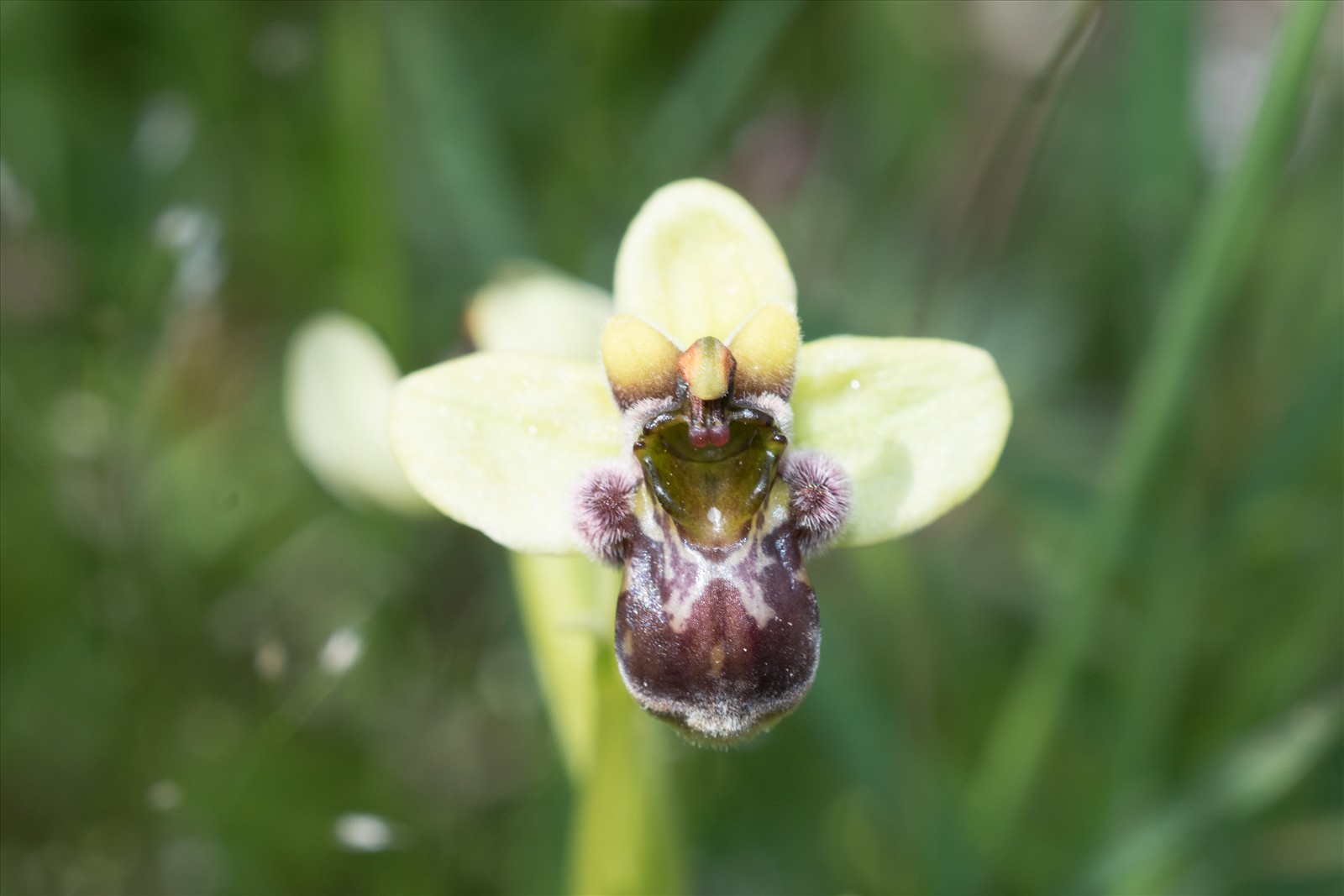 Plante vivace de 10-25 cm, glabre, à 2-3 tubercules subglobuleux ; feuilles oblongues ; bractées plus courtes que l'ovaire ; fleurs 1-4, en épi court et lâche ; divisions extérieures vertes, ovales, étalées, la supérieure en voûte mais éloignée du gynostème, les 2 intérieures courtes, triangulaires, vert rougeâtre, pubescentes ; labelle petit, un peu plus court que les divisions extérieures, ovale-arrondi, noirâtre velouté, marqué d'une tache glabre, trilobé à la base, les 2 lobes latéraux verticaux et coniques, le moyen hémisphérique, subtrilobé, à appendice recourbé en dessous ; gynostème obtus, sans bec.