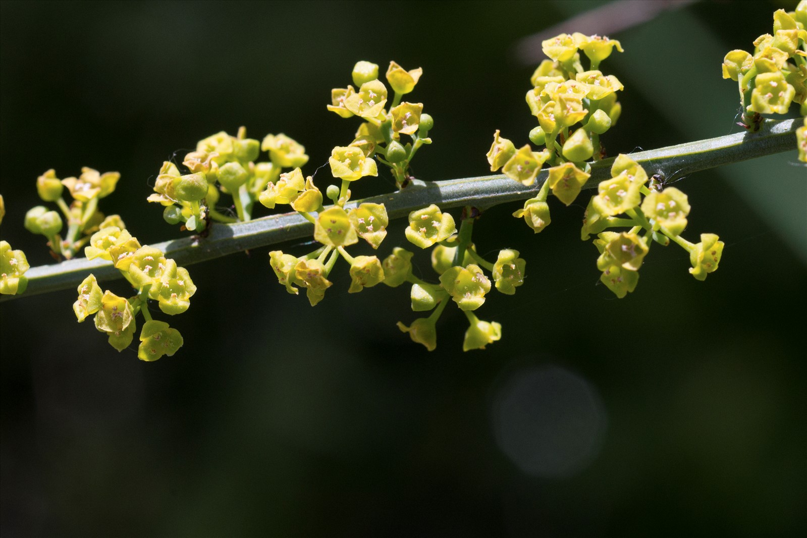 Sous-arbrisseau de 40 cm à 1 mètre, glabre et vert, très rameux, à rameaux dressés, effilés, grêles, anguleux ; feuilles persistantes, coriaces, linéaires-lancéolées, aiguës, uninervées ; fleurs dioïques, jaunâtres, odorantes, les mâles nombreuses, pédicellées, réunies en petites faisceaux latéraux formant d'étroites et longues panicules nues ou peu feuillées, les femelles solitaires et sessiles au sommet de ramuscules assez longs et feuilles ; périanthe à 3 lobes triangulaires, charnus, alternant avec les 3 lobes d'un disque épigyne ; 3 étamines ; 3 stigmates ; drupe peu charnue, grosse et globuleuse comme un pois, à la fin rouge.