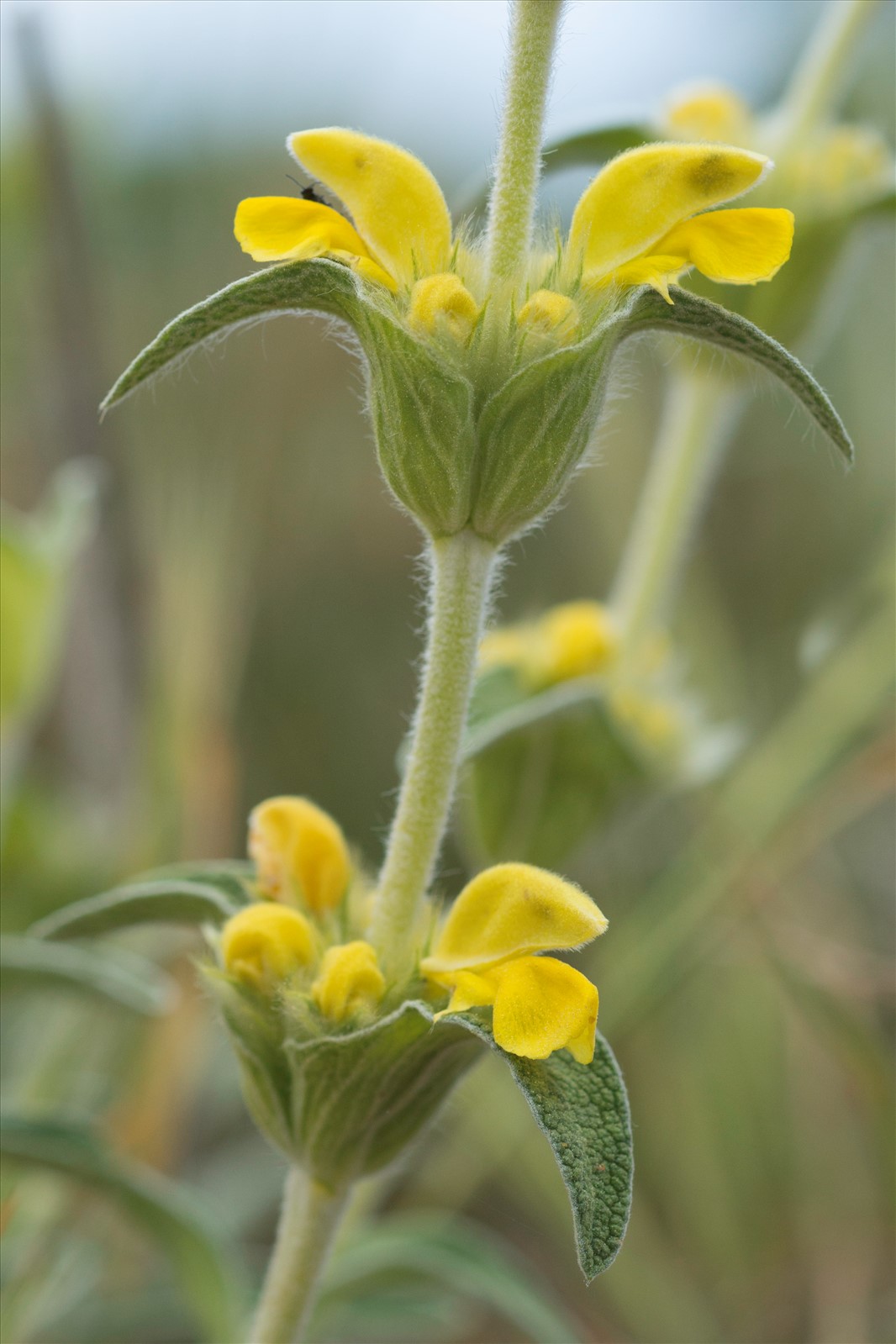 Sous-arbrisseau de 20-50 cm, cotonneux-blanchâtre, à tiges nombreuses, simples, peu feuillées ; feuilles étroites, oblongues ou lancéolées, entières, pubescentes en dessus, blanches-tomenteuses en dessous, fortement nervées-réticulées, les florales bractéiformes, largement ovales-acuminées, ne dépassant pas ou à peine les fleurs ; fleurs jaunes, 6-10 par verticille, ceux-ci 4-8 formant un long épi interrompu terminé par des fleurs ; bractées molles, droites, sétacées, longuement velues-soyeuses, ainsi que le calice à dents en alêne, dressées, longues de 4-5 mm ; corolle de 2-3 cm, tomenteuse en dehors.