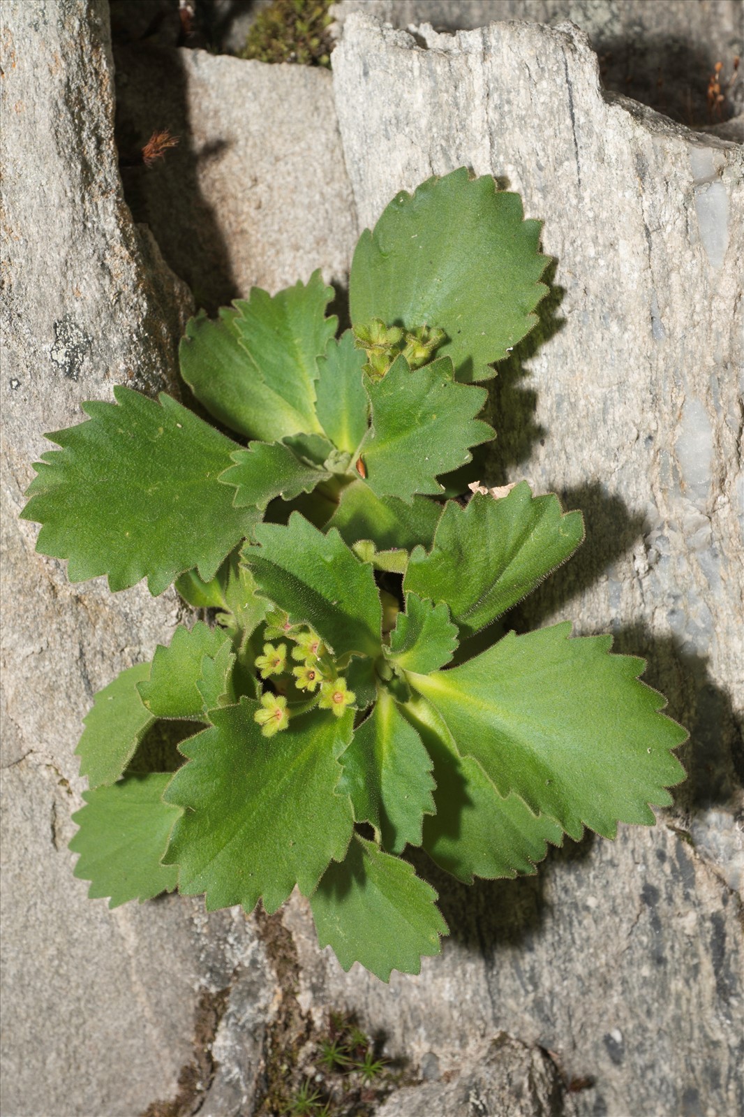 Plante vivace de 3-10 cm, toute pubescente-glanduleuse, d'un vert noirâtre ; hampes grêles, égalant à peu près les feuilles ; feuilles assez petites {2-5 cm de long sur 1-2 de large), obovales ou oblongues, crénelées-dentées, abondamment visqueuses ; fleurs d'un pourpre clair, odorantes, en ombelles pauciflores ; pédicelles bien plus longs que les folioles ovales de l'involucre ; calice pubescent-visqueux, à dents ovales-obtuses ; corolle à tube deux fois plus long que le calice, à lobes échancrés ; capsule plus courte que le calice.