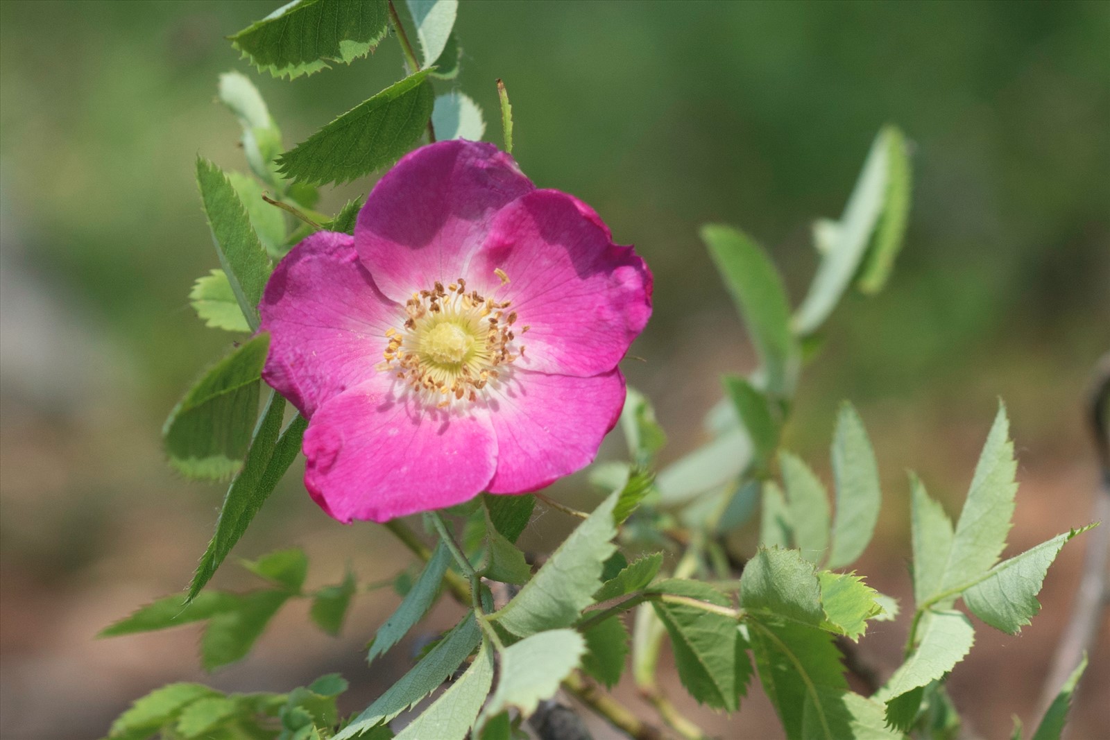 Arbrisseau peu élevé, souvent nain ; aiguillons nuls au-dessus delà base de la tige, rarement quelques-uns sétacés et alternes sous les fleurs ; feuilles à 7-11 folioles assez grandes, glabres ou peu velues, à dents composées-glanduleuses ; stipules supérieures dilatées, à oreillettes dressées ou peu étalées ; fleurs rouges, ordinairement solitaires ; pédicelles longs, lisses ou hispides, arqués-pendants après la floraison; sépales entiers, redressés et persistants sur le fruit mûr ; stigmates en tête velue ; fruit assez gros, d'un rouge vif à la maturité, penchés.