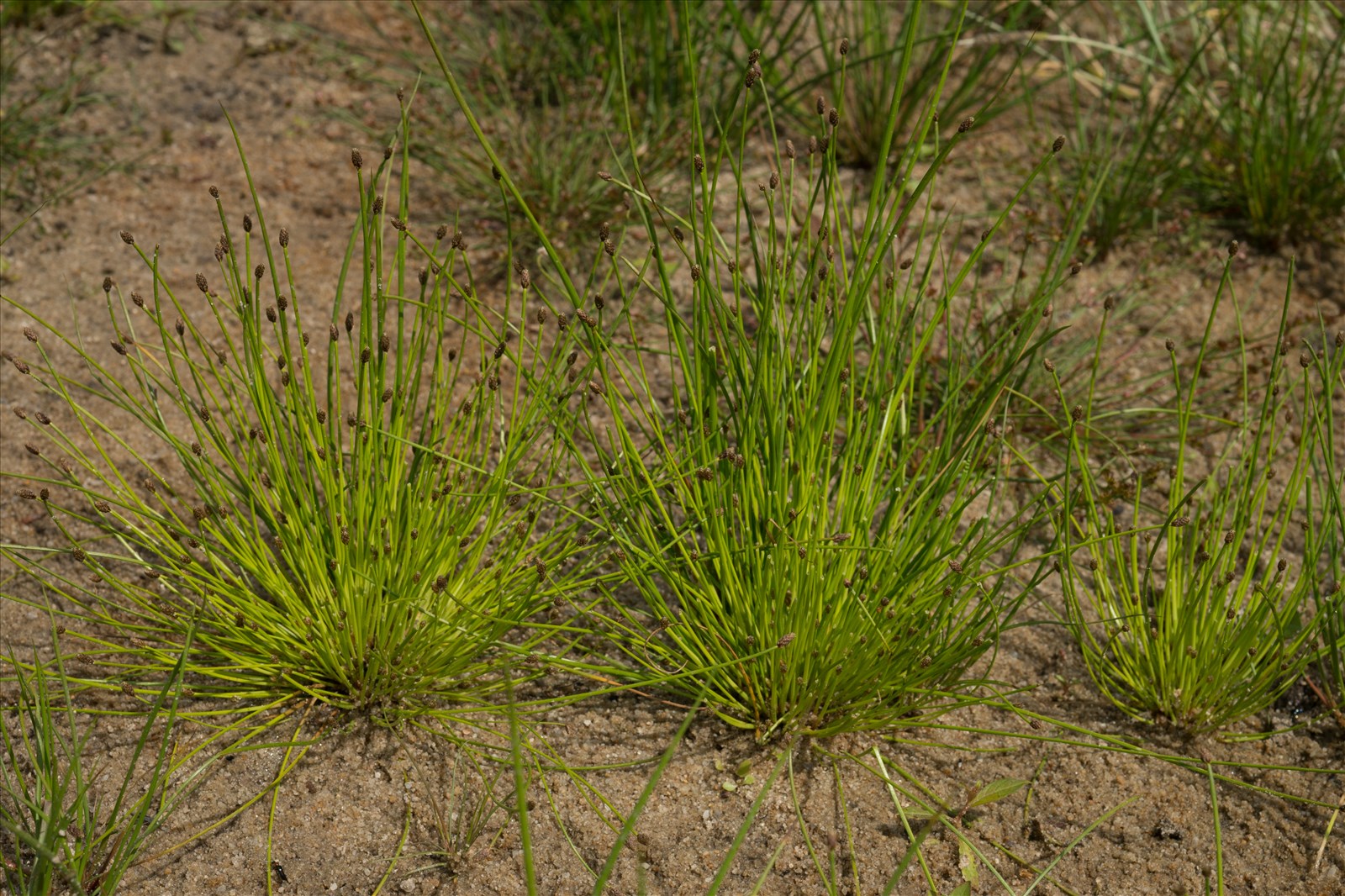 Plante annuelle de 8 à 35 cm, glabre, à racine fibreuse. Tiges en touffe fournie, simples, dressées ou étalées, cylindriques comprimées, munies à la base d'une gaine obliquement tronquée. Épillet long de 4 à 6 mm sur 3 à 4, roussâtre, ovale obtuse multiflore, solitaire, terminal, dressé. Écailles ovales arrondies presque égales, l'inférieure demi-embrassante très courte. 2 stigmates. 4 à 6 soies scabres, dépassant l'akène fauve, obovale-comprimé, lisse, couronné par un mamelon aussi large que long.