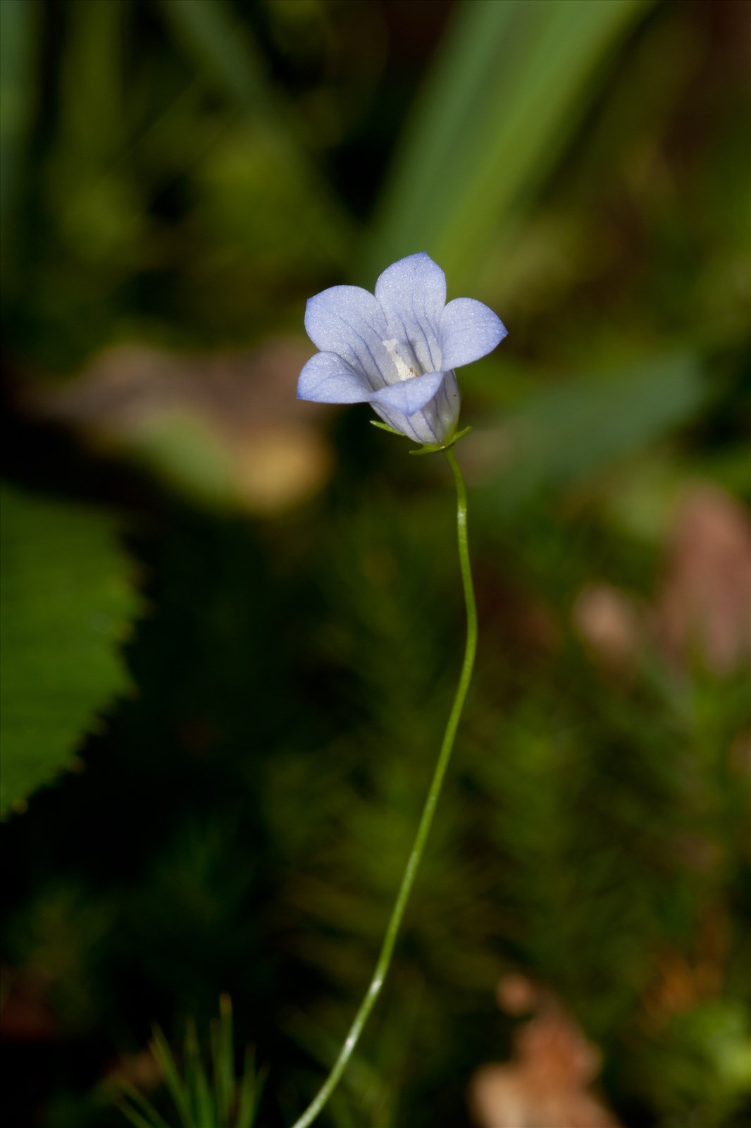 Plante vivace de 10-30 cm, délicate, verte, glabre, gazonnante, à racine rampante ; tiges filiformes, couchées, rameuses, feuillées ; feuilles très minces, glabres, toutes pétiolées, palmatinervées, en coeur à la base, à 5-7 lobes triangulaires ; fleurs d'un bleu pâle, petites (à peine 1 cm de long), solitaires sur de longs pédoncules filiformes, terminaux ou opposés aux feuilles ; calice à lobes linéaires en alêne, 2-3 fois plus courts que la corolle ; capsule subglobuleuse ; graines ovoïdes en fuseau, striées en long, blanchâtres.