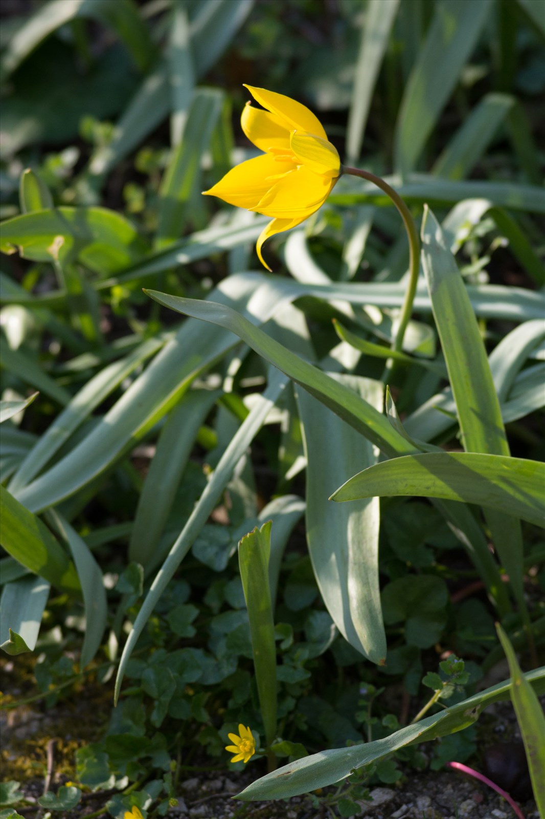 Plante vivace de 30 à 60 cm, assez robuste, à bulbe médiocre non laineux ; feuilles ordinairement 3, linéaires-lancéolées, allongées ; fleur penchée dans le bouton, assez grande, jaune, un peu verdâtre à l'extérieur ; périanthe long de 3-5 cm, presque en entonnoir, à divisions acuminées et barbues au sommet, très inégales, les intérieures ovales-lancéolées, ciliées à la base, les extérieures lancéolées, glabres à la base ; étamines à filets poilus à la base ; capsule oblongue-trigone de 3 cm environ, bien plus longue que large.