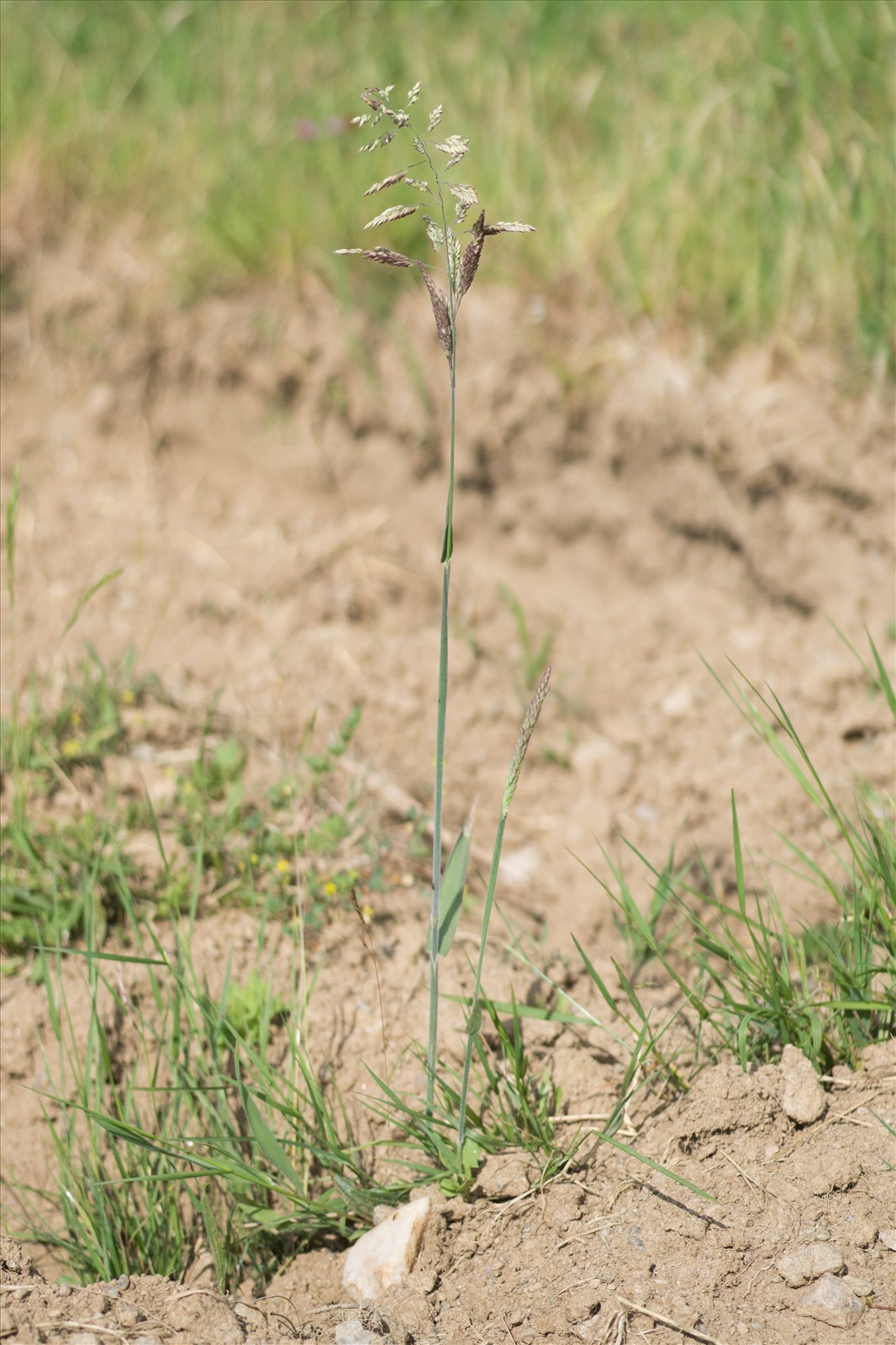 Plante vivace de 40-80 cm, mollement velue sur les feuilles, les gaines et autour des noeuds, a souche courte tronquée ou un peu rampante ; feuilles d'un vert blanchâtre, planes, molles ; ligule assez courte, tronquée et déchirée ; panicule longue de 10-20 cm, ovale oblongue, pubescente, rougeâtre ou d'un blanc rosé ; épillets longs de 4-5 mm ovales, à axe glabrescent, non barbu sous la fleur supérieure ; glumes subobtuses, la supérieure mucronée ; glumelle de la fleur supérieure munie vers le quart supérieur dune arête à la fin courbée en crochet et incluse.