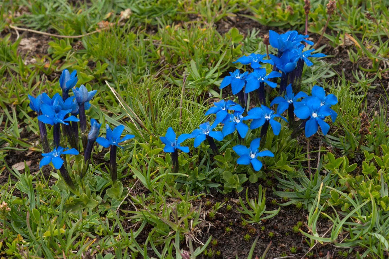 Plante vivace de 3 à 12 cm, glabre, à souche courte, gazonnante ; tiges florifères dressées ; feuilles courtes, très petites ; fleurs d'un bleu forcé ; calice anguleux, à cinq lobes plus courts que la moitié de son tube.