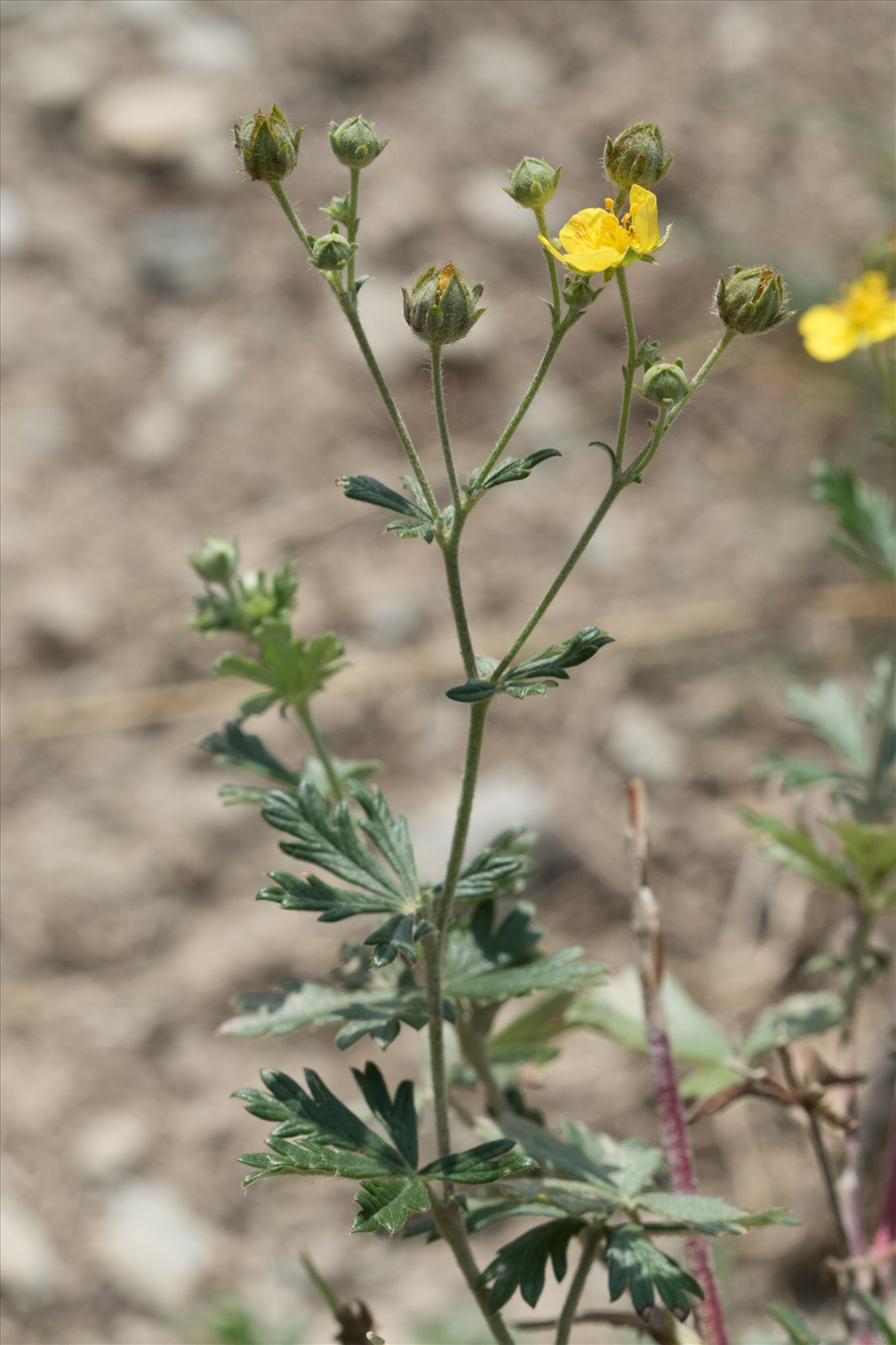 Plante vivace de 20-50 cm, tomenteuse-blanchâtre, à souche courte ; tiges terminales, assez robustes, étalées-ascendantes, très feuillées ; feuilles digitées, à 5 folioles obovales-oblongues, à bords un peu roulés, vertes en dessus, blanches-tomenteuses en dessous, rétrécies et entières à la base, élargies et profondément incisées-dentées dans le haut ; stipules souvent incisées ; fleurs jaunes, petites (6-10 mm), en cymes corymbiformes feuillées ; calicule à lobes égalant le calice ; pétales peu émarginés, égalant le calice ; carpelles finement ridés, non bordés.