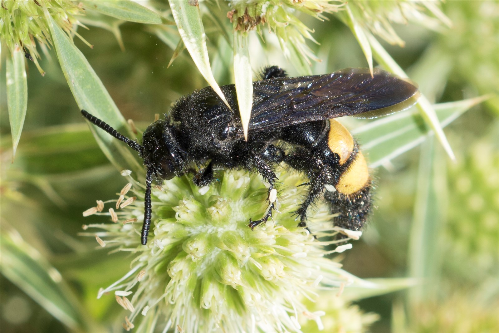 Cette grosse guêpe noire et jaune mesure entre 12 mm et 25 mm, la femelle étant de dimension plus importante que le mâle. Elle est caractérisée par deux bandes jaunes sur le dessus de l'abdomen. Cette espèce évolue dans les milieux ouverts et chauds (pelouses sèches). Pour assurer la reproduction de l'espèce, il est nécessaire pour elle de rechercher les larves de coléoptères dans le sol afin d'y pondre ses oeufs. On observe les adultes durant l'été.