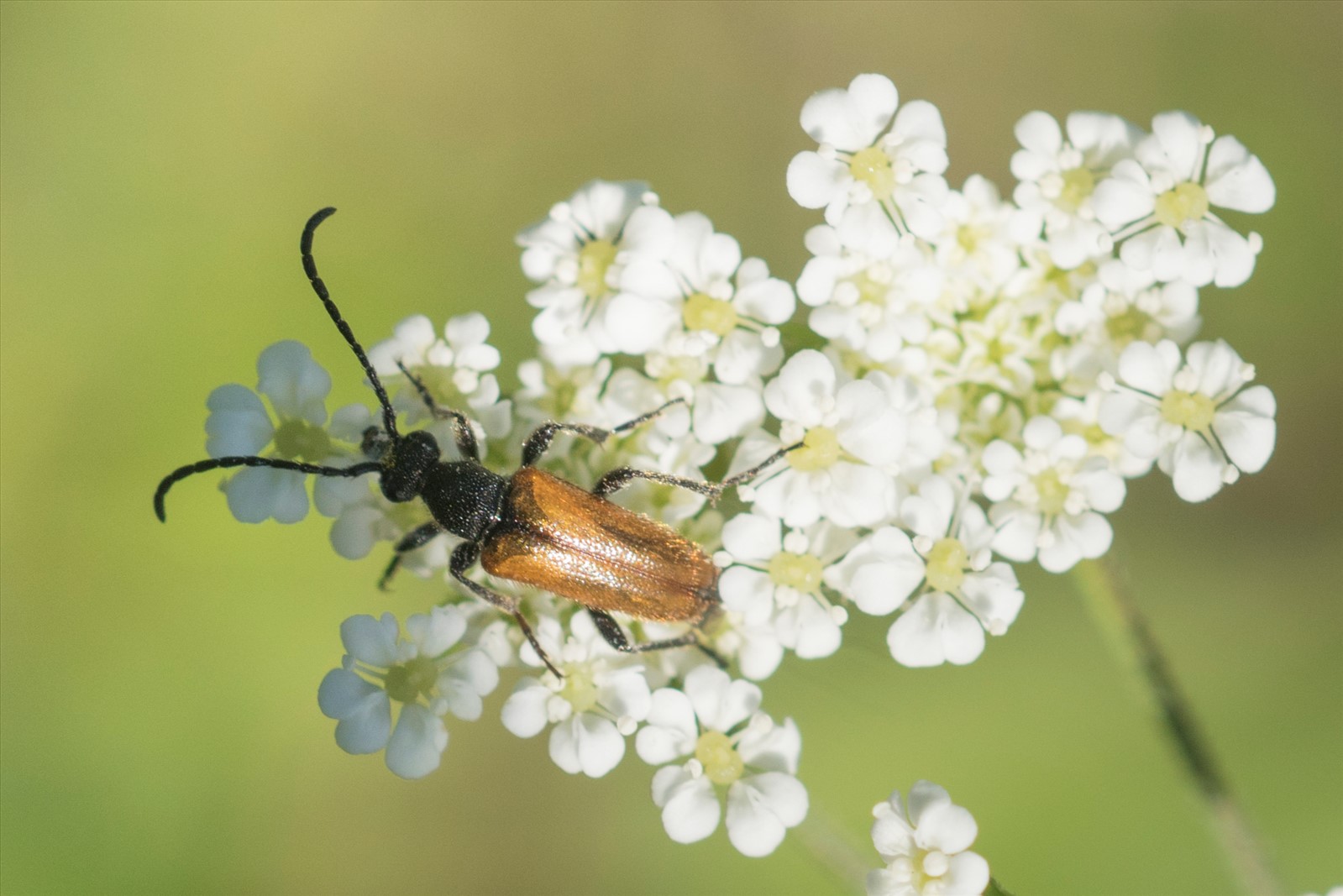 La larve se nourrit de bois mort de feuillus. Les adultes sont floricoles. On les trouve particulièrement sur les ombellifères et les ronces. Les pattes sont toujours noires. Le pronotum est également noir et ses bords sont arrondis.