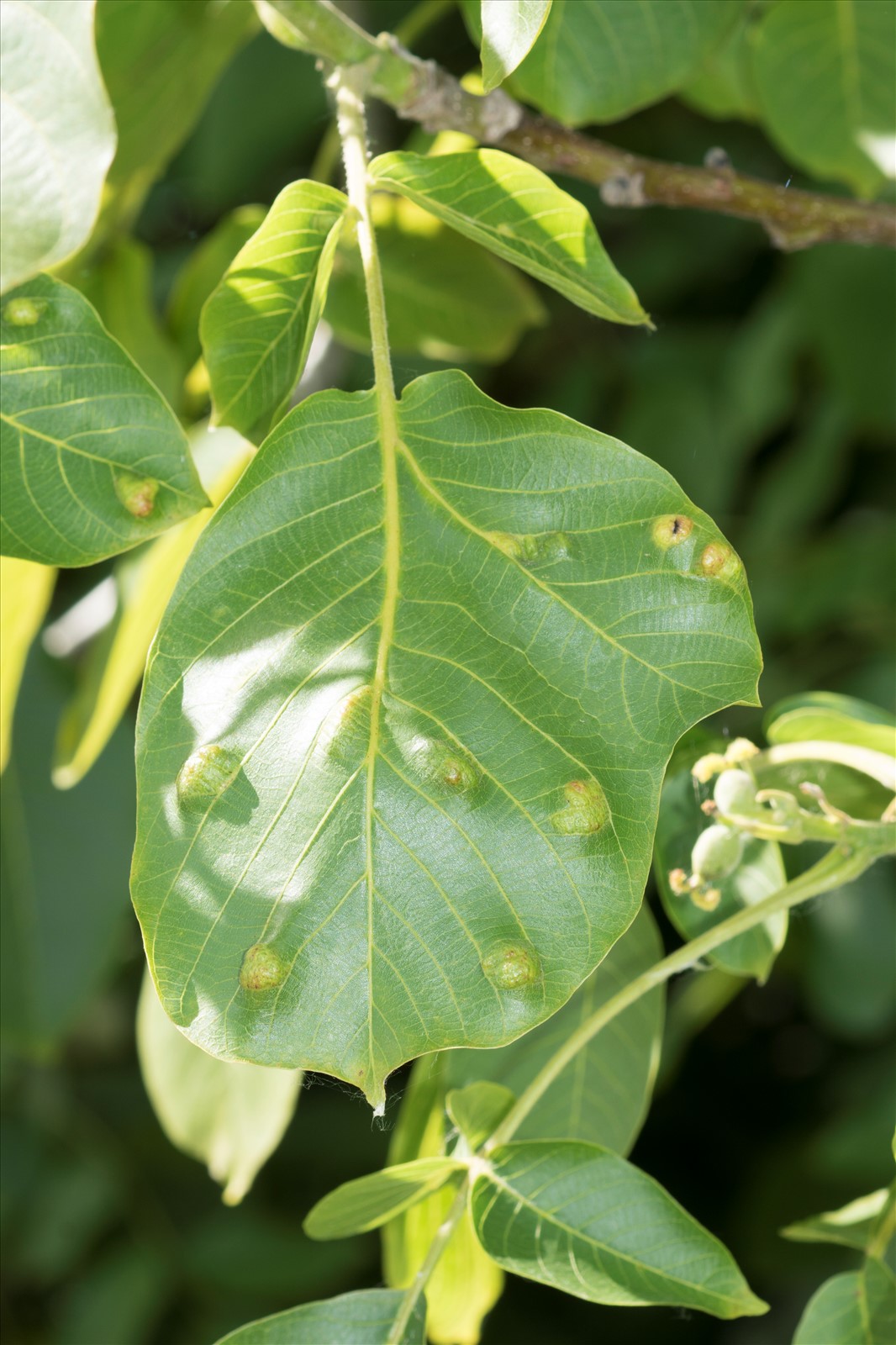Cette acarien provoque une galle caractéristique en forme de boursouflure sur la face supérieure de la feuille du noyer.