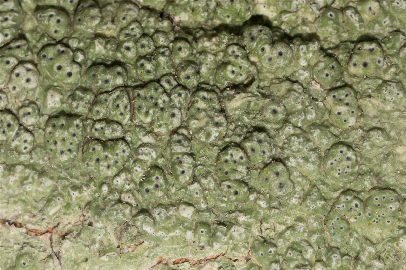 Ce lichen est relativement commun sur les écorces des arbres. Il peut être saxicole, seulement sur roche siliceuse. Son thalle est gris à gris vardâtre. Il est délimité par un prothalle. Le thalle est couvert de sortes de petites verrues contenant de 2 à 6 apothécies (Apparence de dent cariée). Réaction colorée jaune à K et KC.