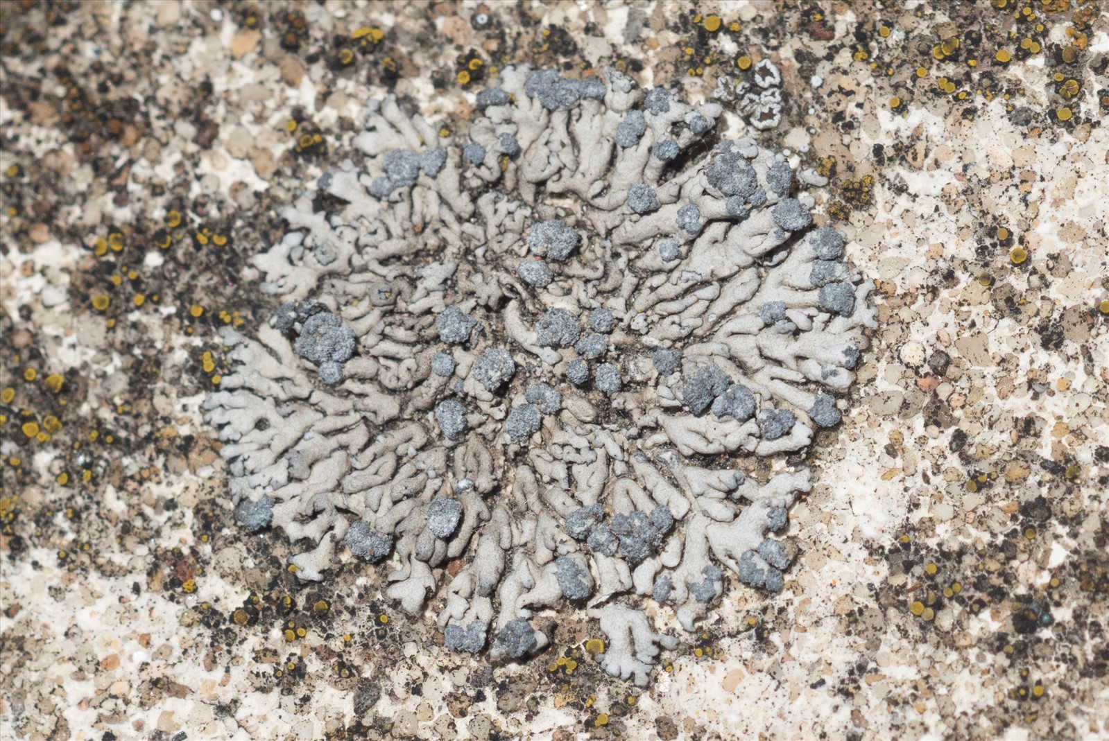 Ce lichen est saxicole, plutôt calcicole. Le thalle comporte des soralies globuleuses gris bleuté. La face supérieure du thalle comporte de nombreux points blancs visibles à la loupe.La médulle réagit à K par une couleur jaune contrairement à Physcia dubia.