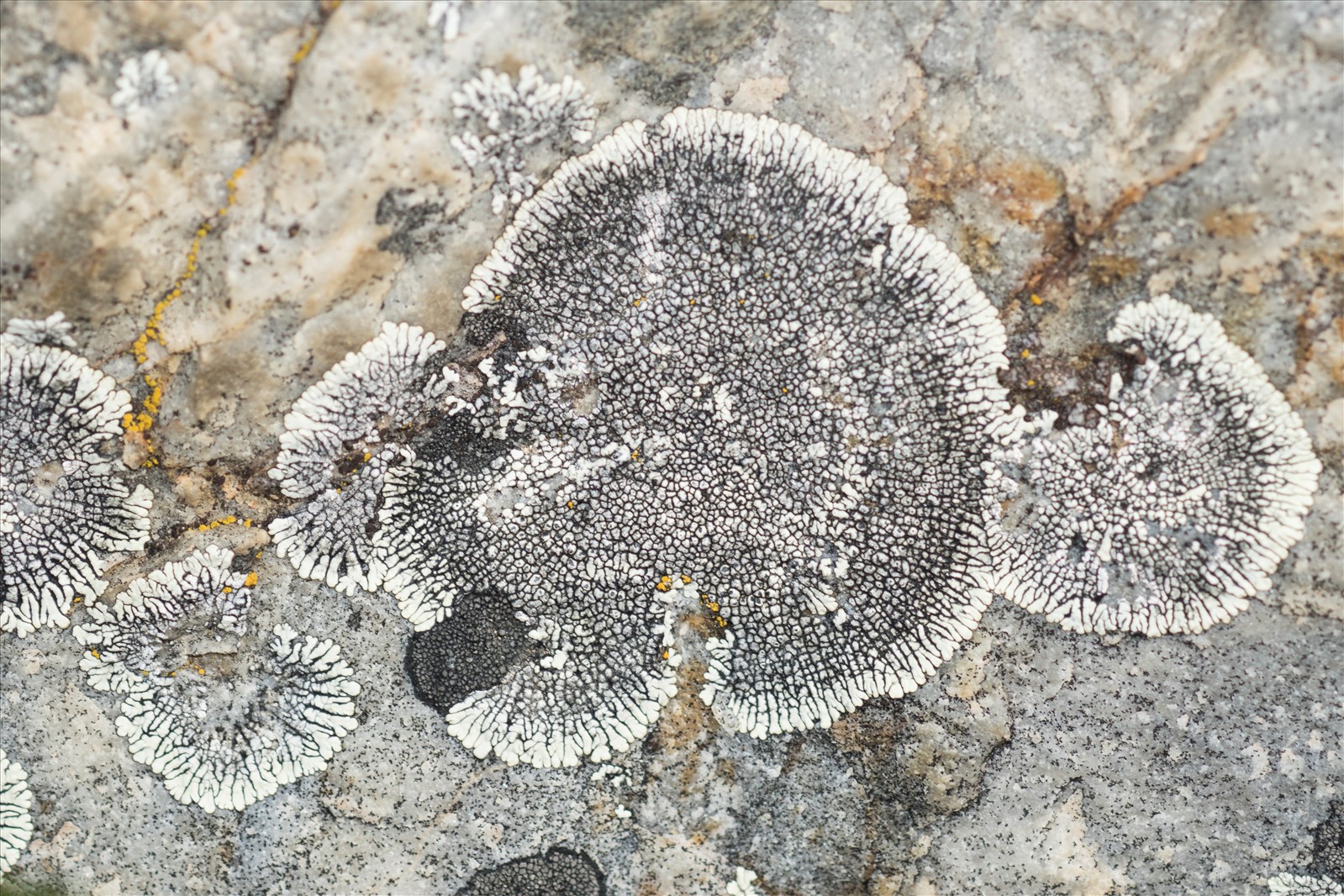 Ce lichen saxicole a un thalle blanc jaunâtre, parfois jaune verdâtre qui est très fendillé, aréolé. On observe un hypothalle noir. Les apothécies sont noirs : ce critère permet de le différencier de Caloplaca carphinea très ressemblant qui possède des apothécies brunes. On l'observe sur roche non calcaire, en particulier sur des surfaces inclinées. Il est assez fréquent en montagne (Alpes, Pyrénées, Massif Central, Corse). La clé des lichens d'Europe Occidentale de G. Clauzade et C. Roux distingue 5 chémotypes suivant les réactions colorées à C et P.